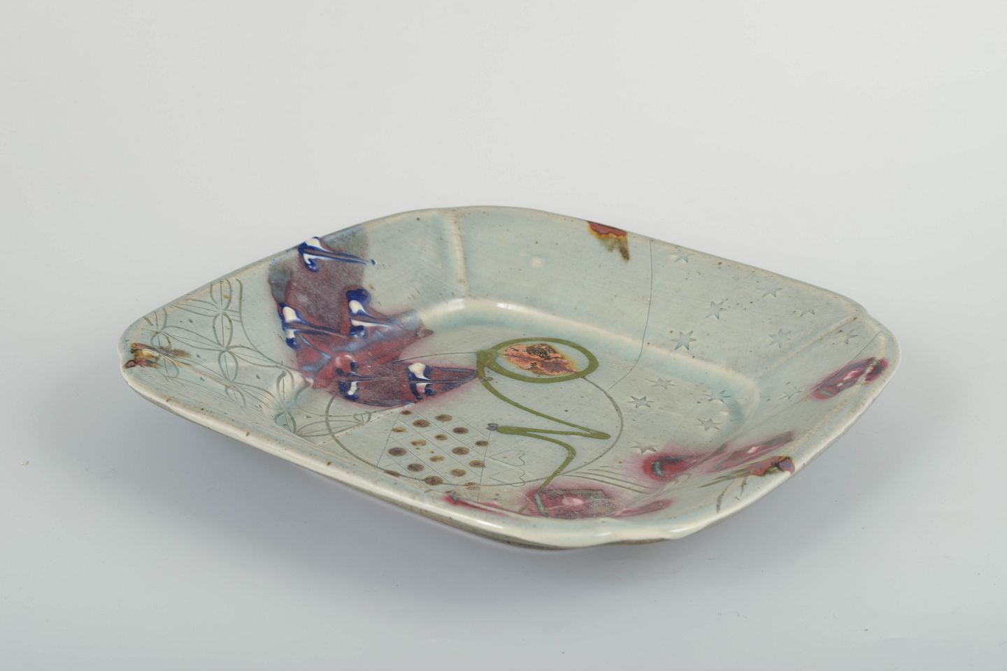 Unikt kvadratisk fad i kinesisk-inspireret stil med dekorativ relief- og penselmalet dekoration samt lys celadonlignende glasur med farvede detaljer. Signeret.