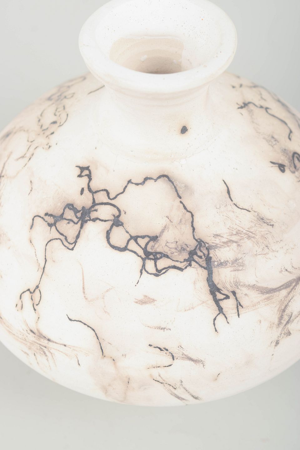 Unik hånddrejet vase i stentøj med lys glasur og karakteristisk marmoreret dekoration i brune og sorte nuancer. Blød, rund form med kort hals og lille åbning. Signeret.