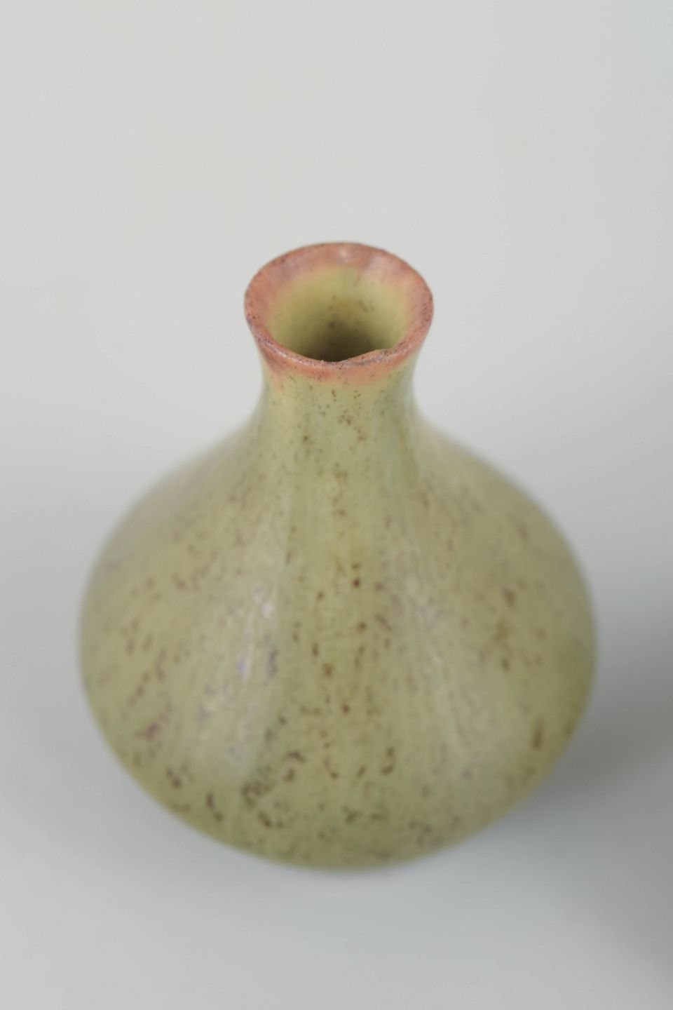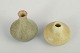 To elegante miniaturevaser i stentøj, begge med karakteristiske, bløde organiske former og subtile matte glasurer. Den ene i grønligt skær med rosa tone ved halsen, den anden i lysegule nuancer med fint spil i overfladen – typisk for Stålhane’s eksperimenterende glasurarbejde.
