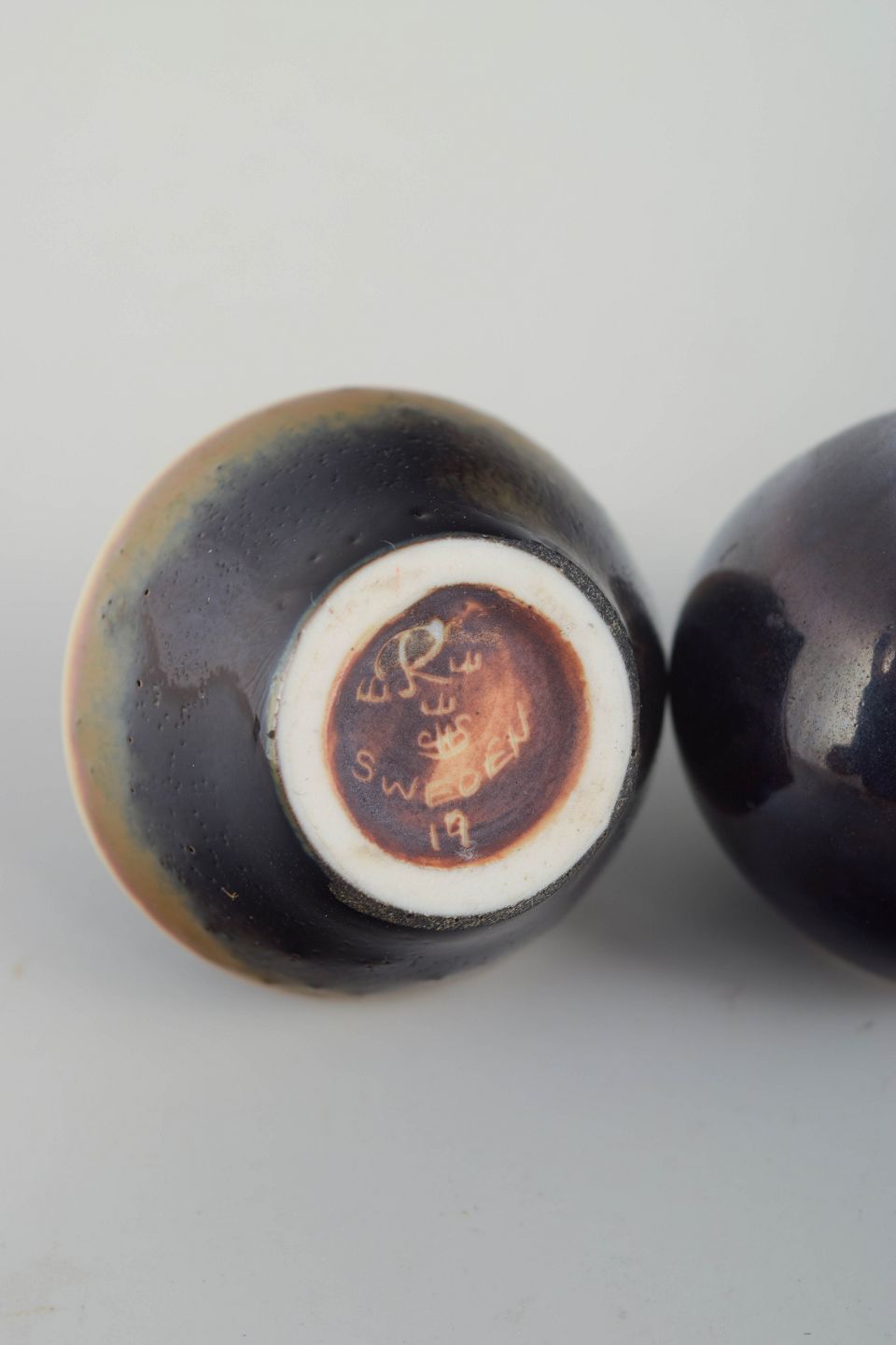 To hånddrejede miniaturevaser i stentøj med smukke, dybt mættede glasurer i mørke violette og brunlige toner, begge med Stålhane’s karakteristiske sans for proportioner og overfladespil.