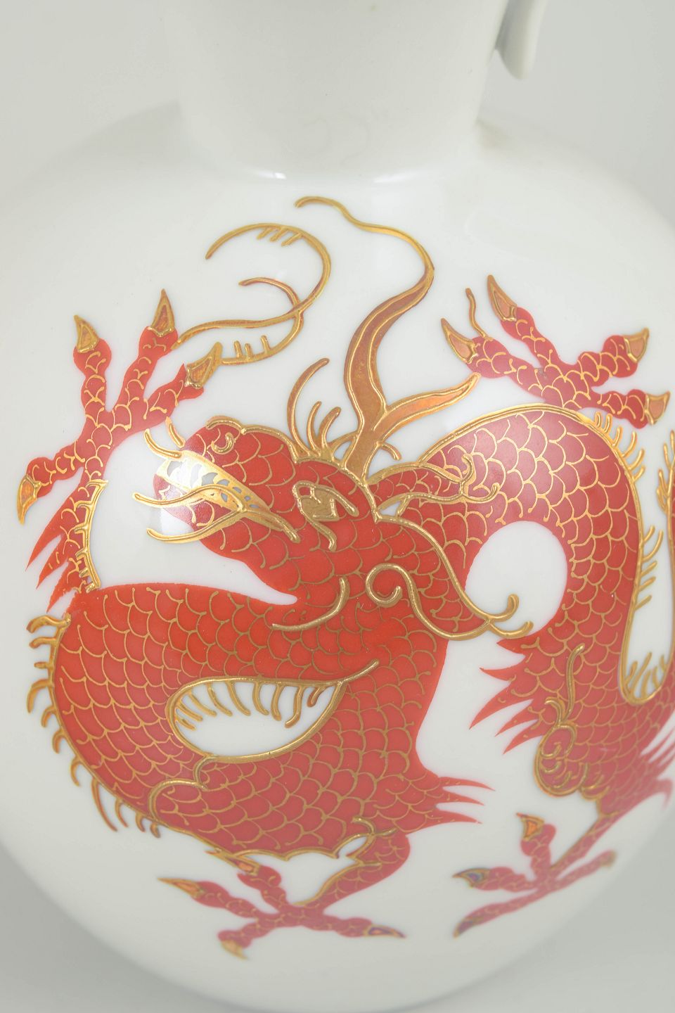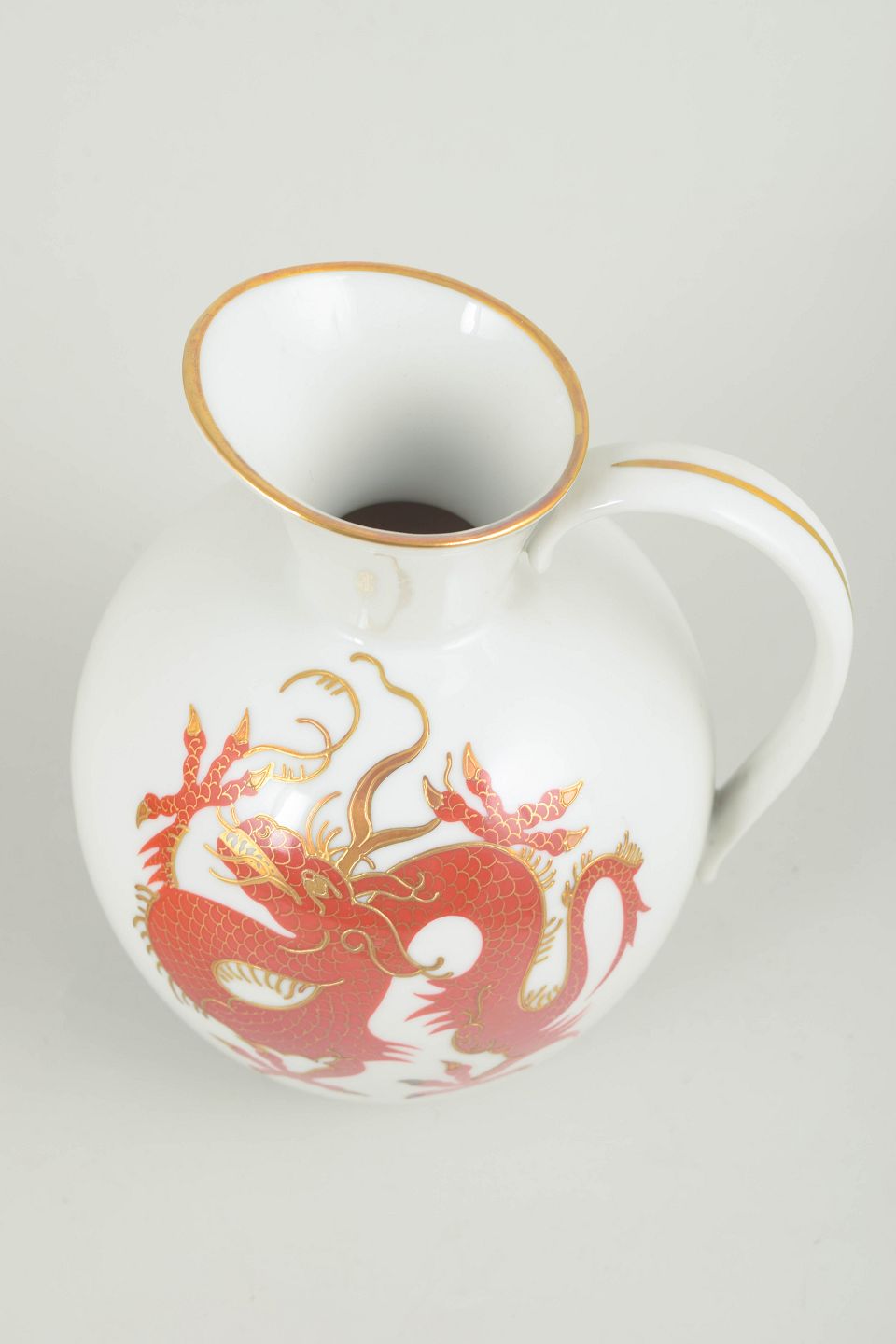 Balusterformet kande i hvidglaseret porcelæn dekoreret med rød Mingdrage og forgyldt kant. Modellen er mærket Schaubach Germany og Gold Plated under bunden.