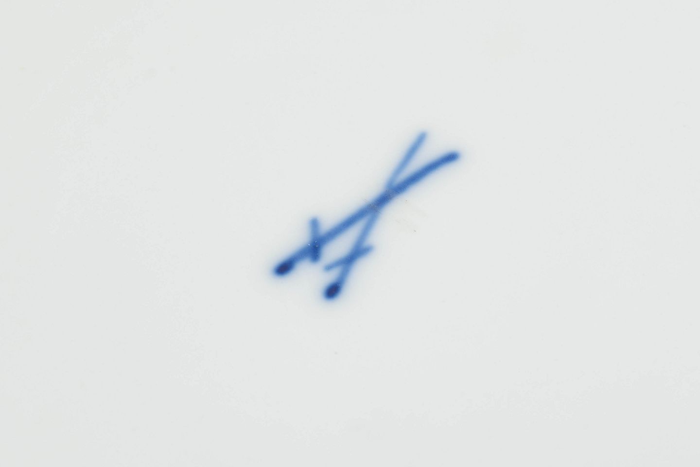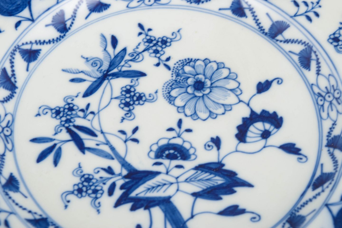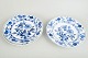 Middagstallerkener i hvidt porcelæn dekoreret i underglasur, løgmønster med bølget fane. Mærket i bunden med Meissens krydsede sværd.