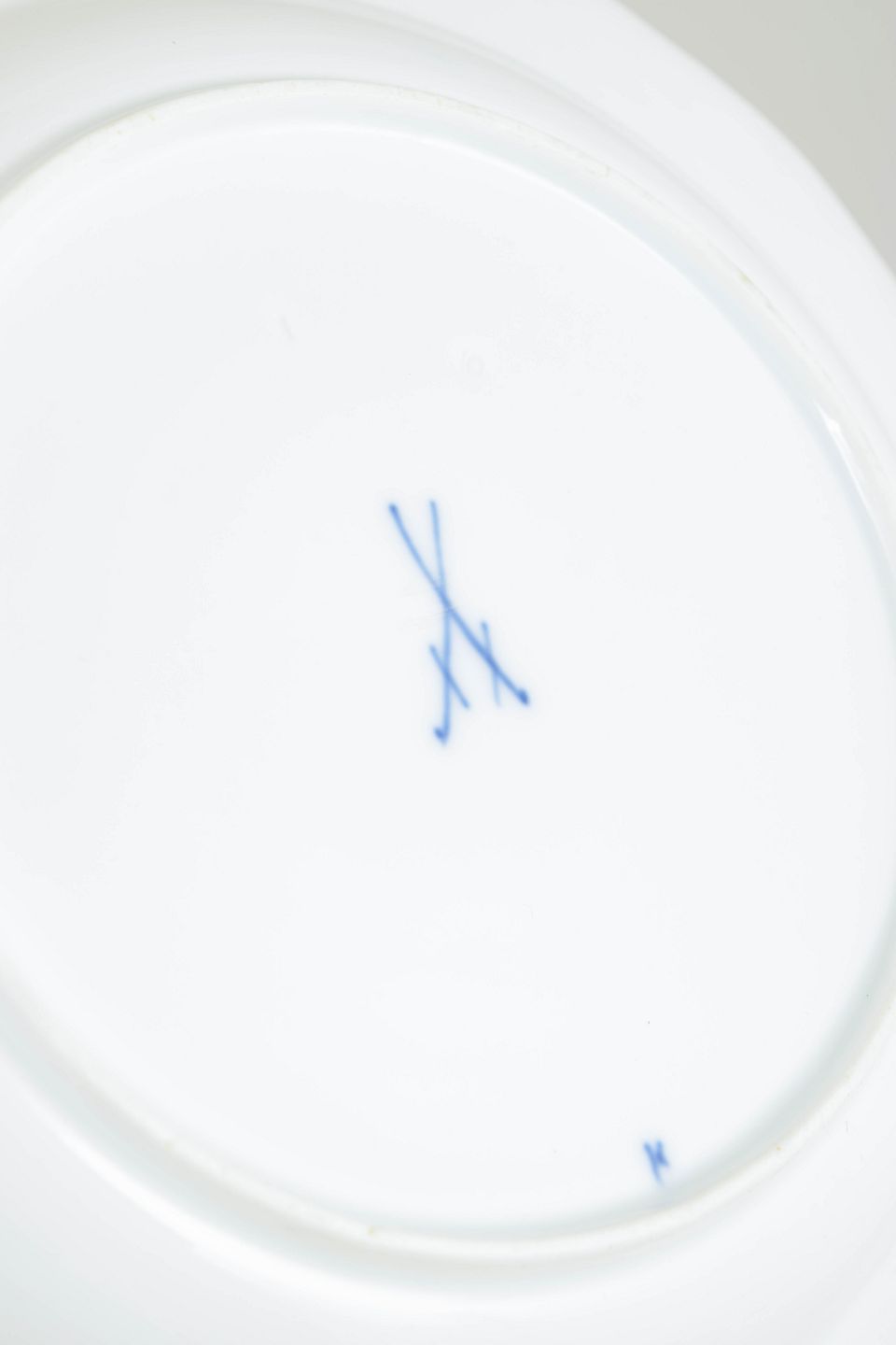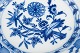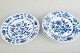 Middagstallerkener i hvidt porcelæn dekoreret i underglasur løgmønster med bølget fane. Mærket i bunden med Meissens krydsede sværd.