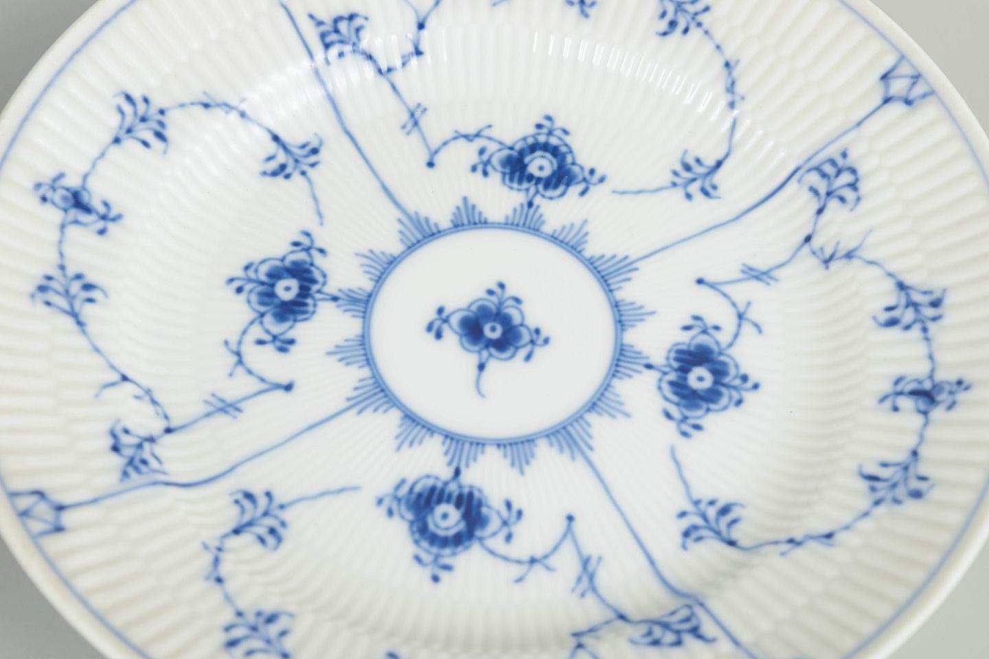 Royal Copenhagen blev grundlagt i 1775 i København under kongelig bevilling. Fabrikken er internationalt anerkendt for sit håndmalede porcelæn og sit høje kunstneriske niveau. Musselmalet Riflet er fabrikkens mest klassiske stel, introduceret i slutningen af 1700-tallet og fortsat produceret med traditionelle håndværksmetoder.