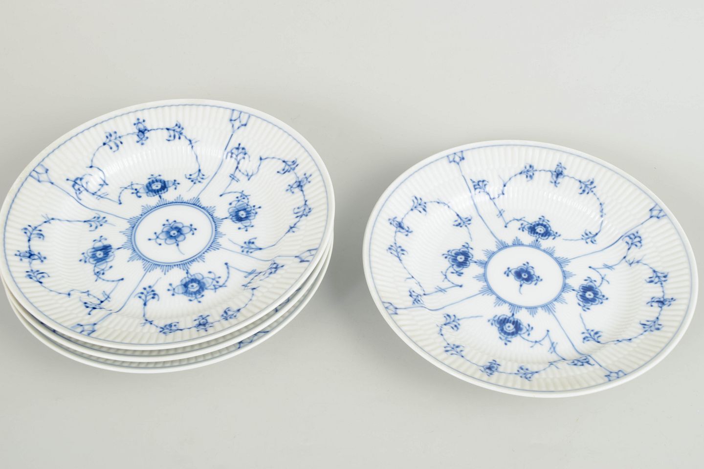 Royal Copenhagen Musselmalet Riflet sæt af fire frokosttallerkener.