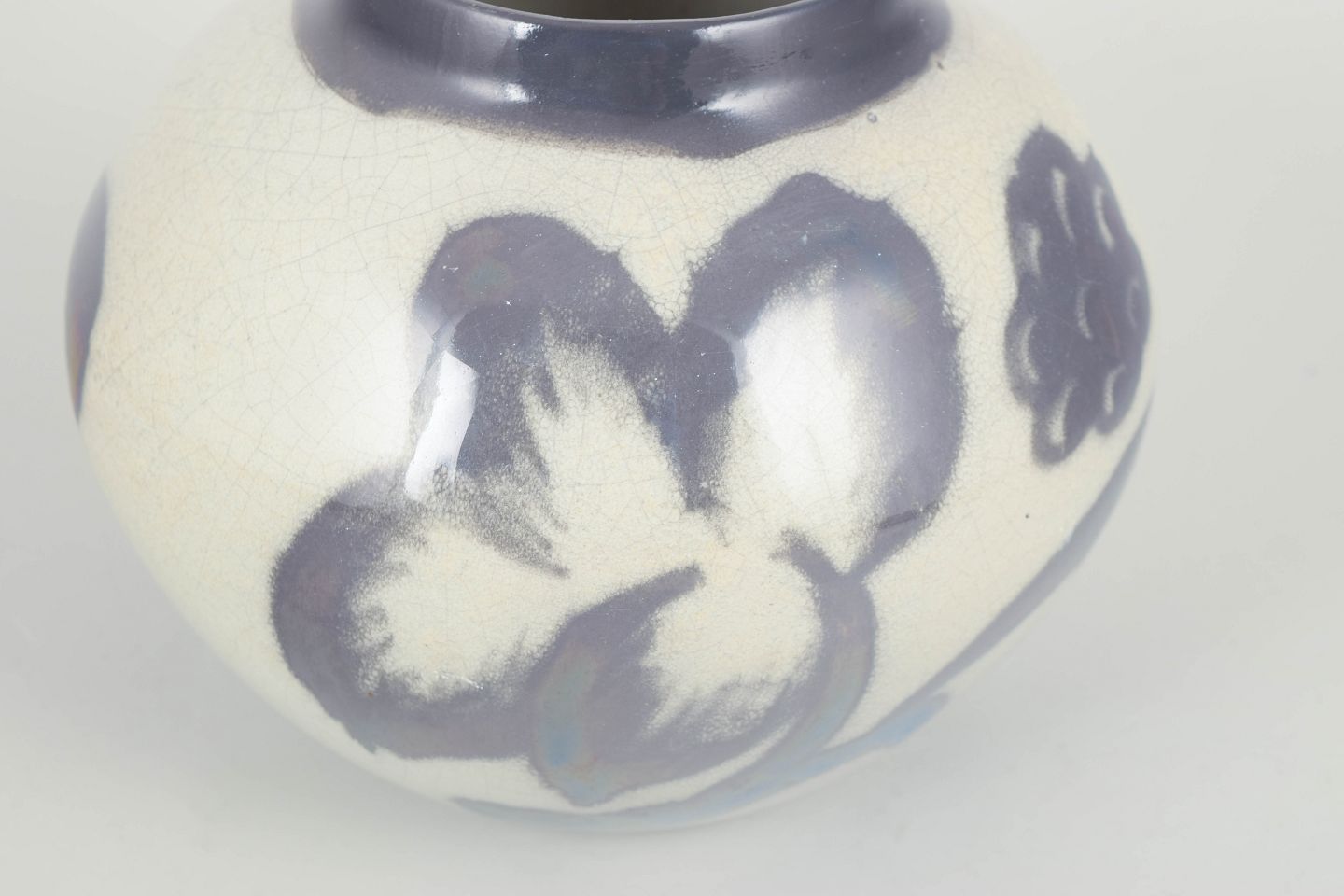 Organisk formet vase i keramik med blød, rund korpus og håndmalet dekoration i blåviolette nuancer på lys bund. Signeret EB under bunden.