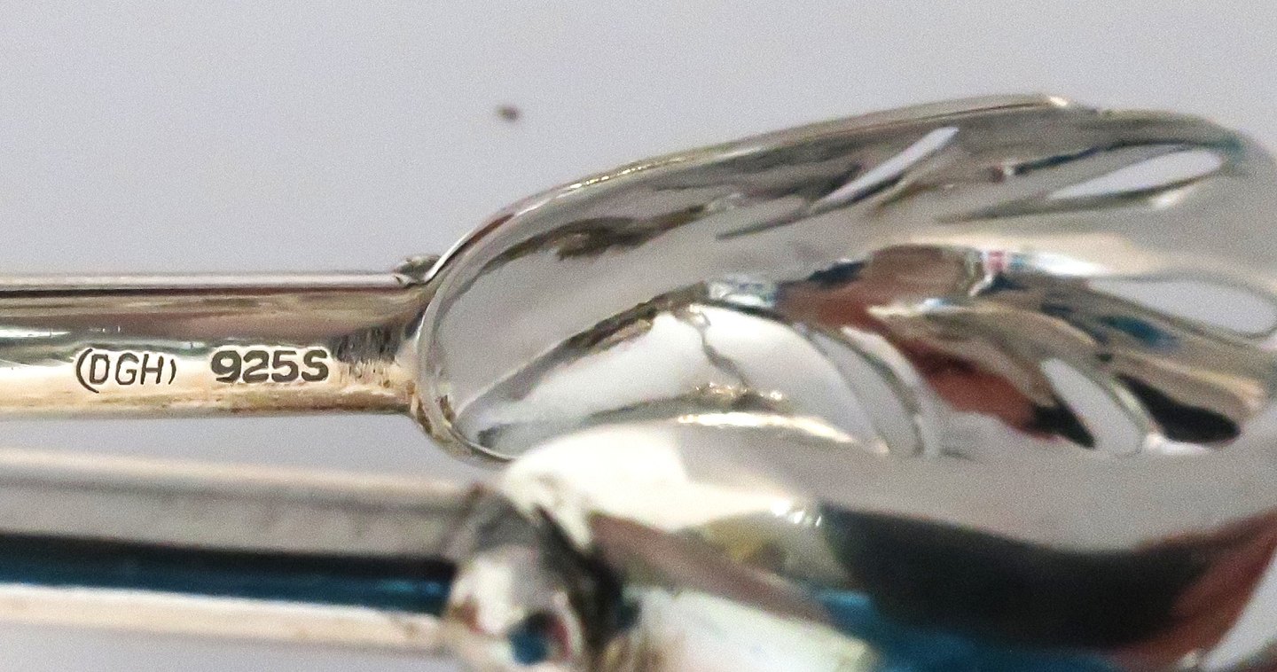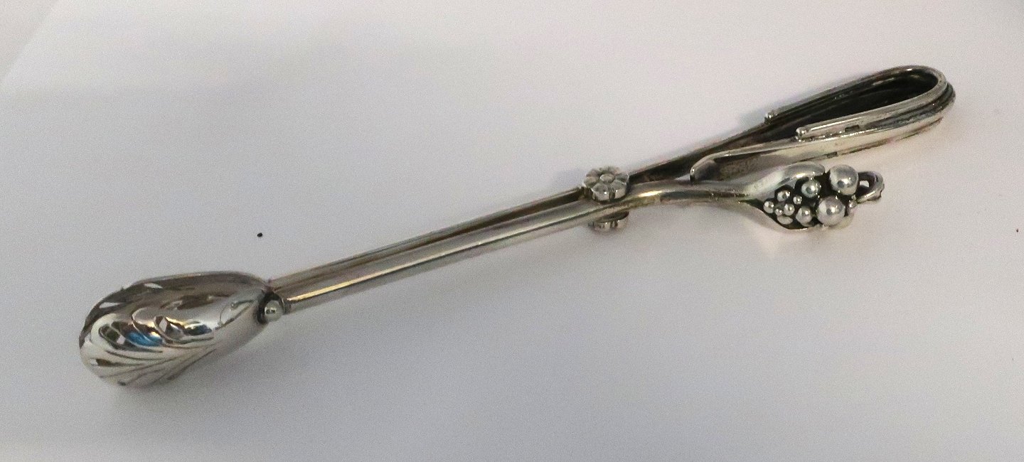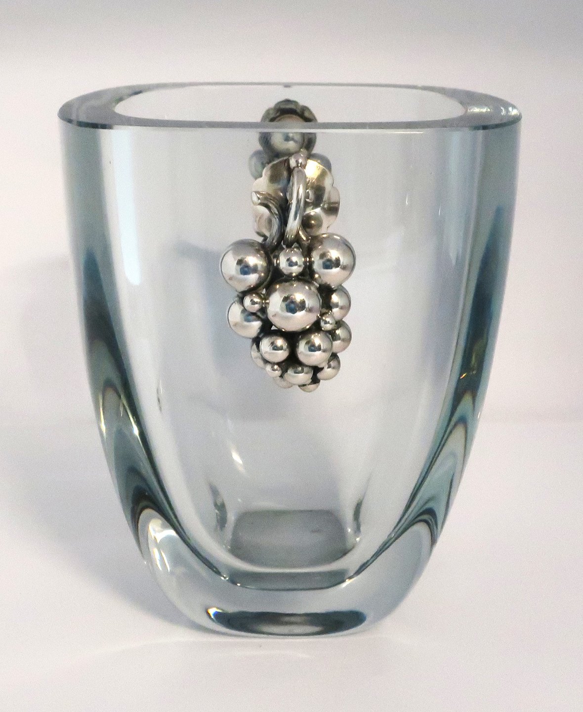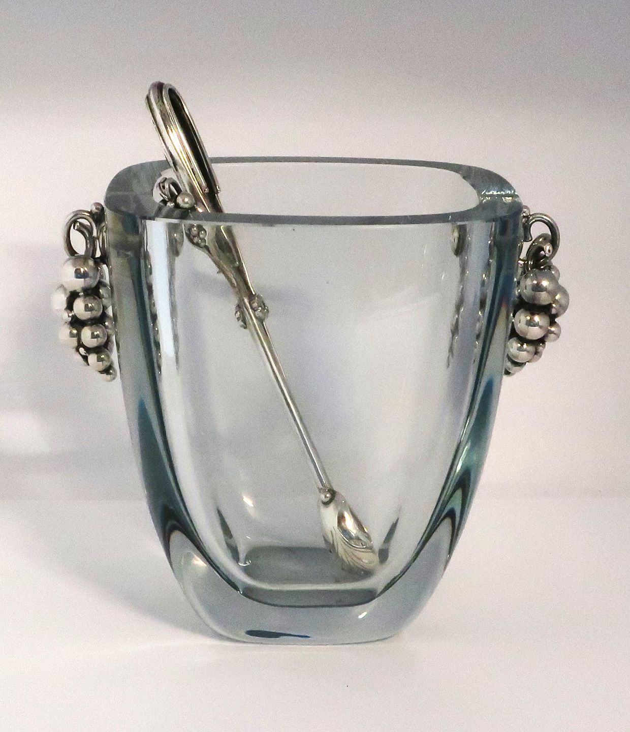 Dansk Guldsmede Haandværk, (DGH). Holmegaard isspand med sterling håndtag i form af en drueklase. Højde 15,5 cm. Bredde 13 cm. Medfølger tilhørende istang i sterling sølv.