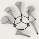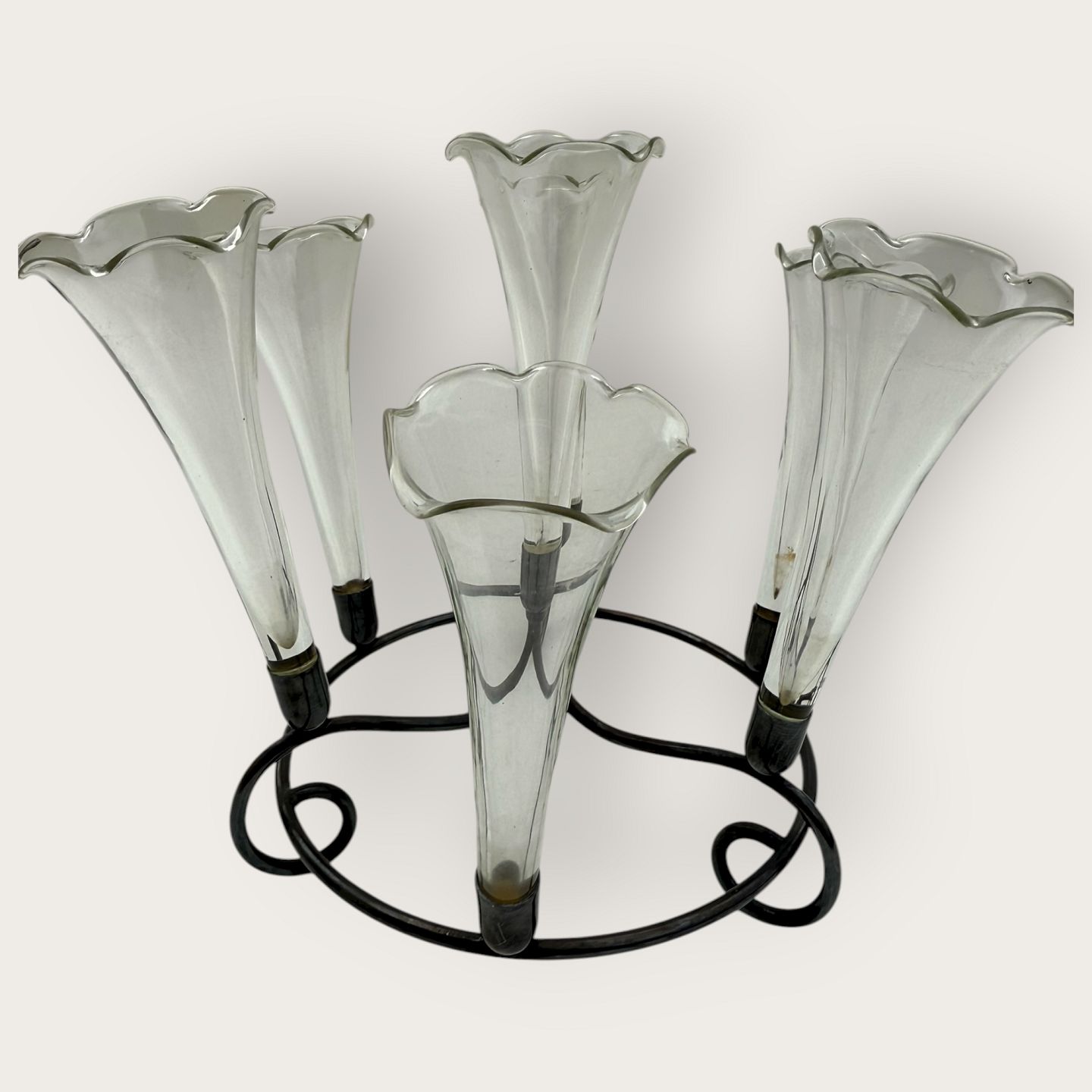 Epergne-Vase, Feines dünnes Glas mit gerüschtem Rand, alle Vasen mit versilberter Montierung, 7 Vasen in Jugendstil-Halterung, ca. 19cm hoch und 24cm im Durchmesser, jede Glasvase 13x5cm *Guter Zustand*