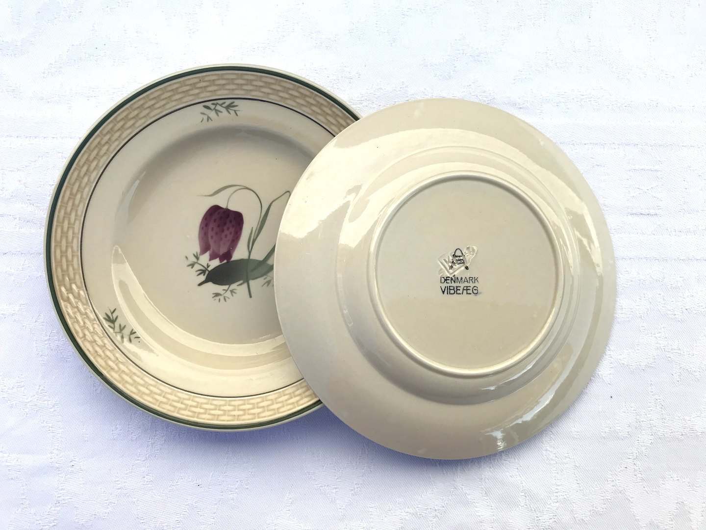 Royal Copenhagen, Aluminia, Victoria II stelform, Vibeæg, Fritillaria meleagris, Kagetallerken, 15cm i diameter, Design Nils Thorsson *Pæn brugt stand*