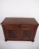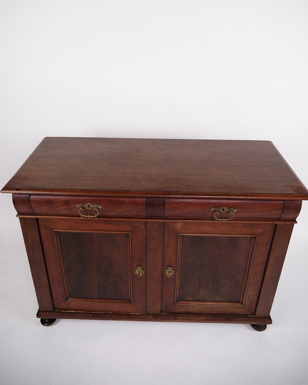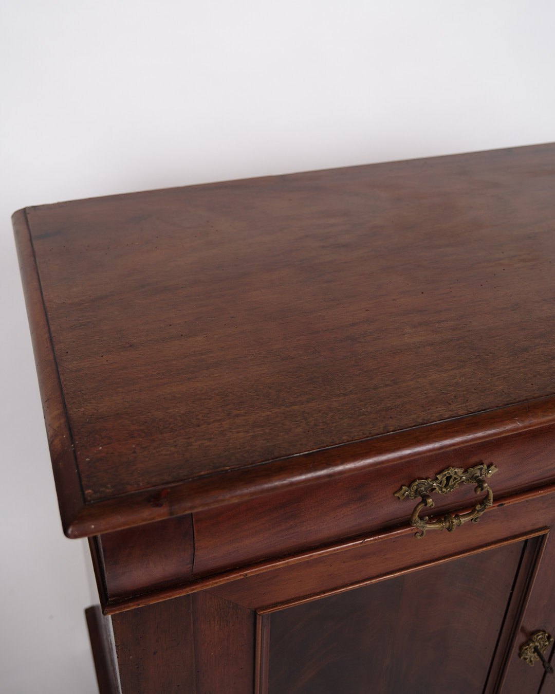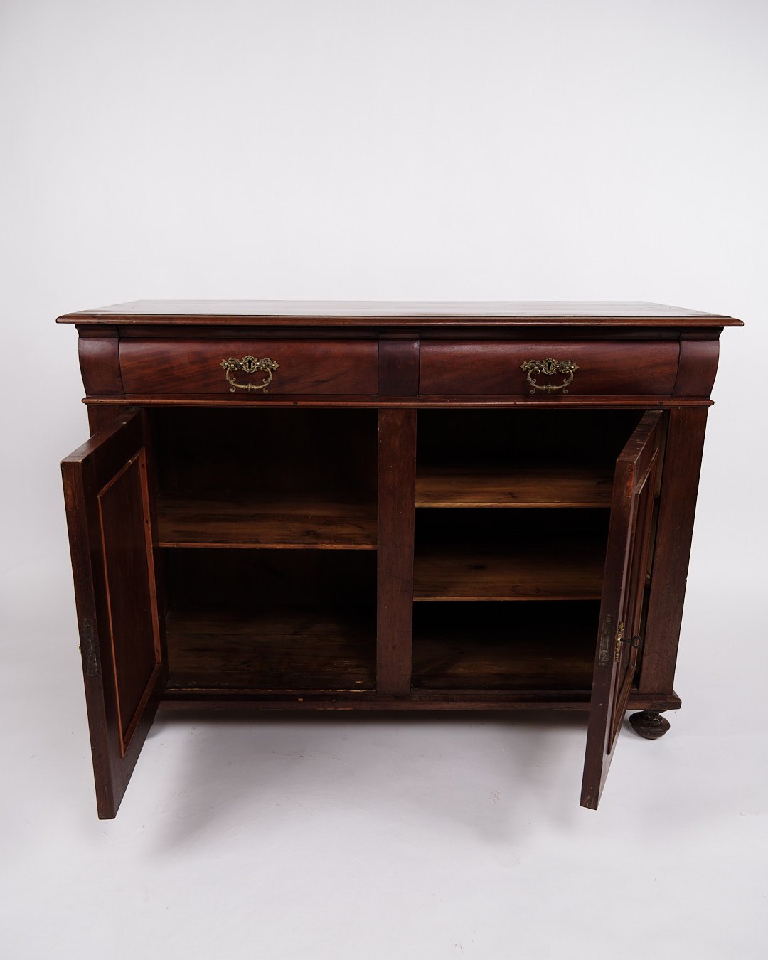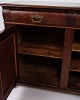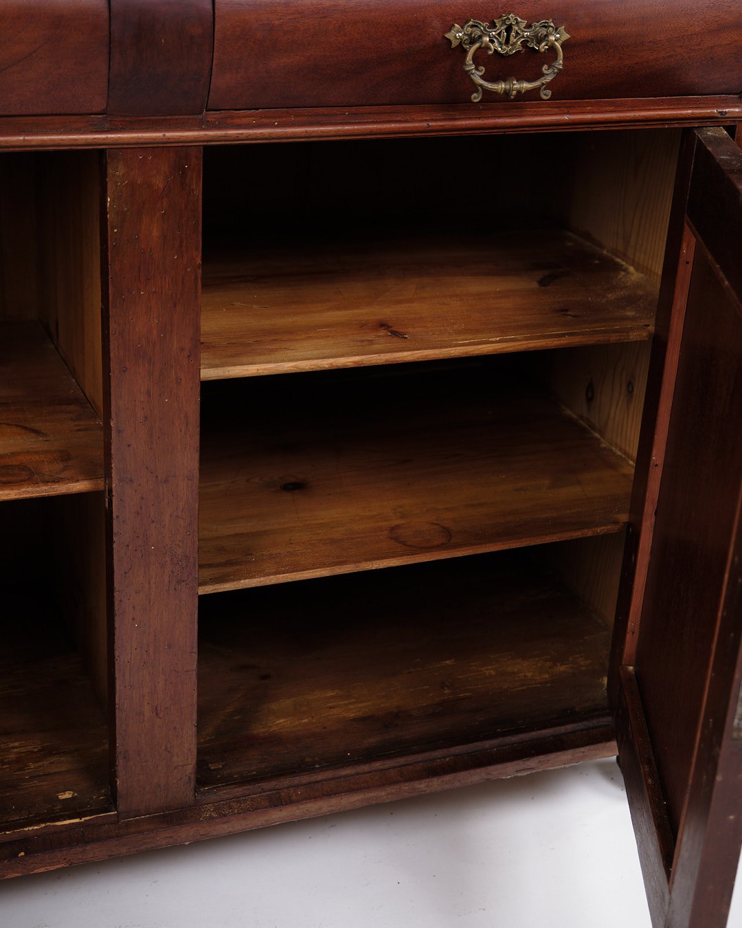 lav antik skænk fra 1880’erne, udført i håndpoleret mahogni. Skænken er indrettet med faste hylder og fremstår med tidstypiske detaljer, der vidner om 1800-tallets solide snedkerhåndværk.