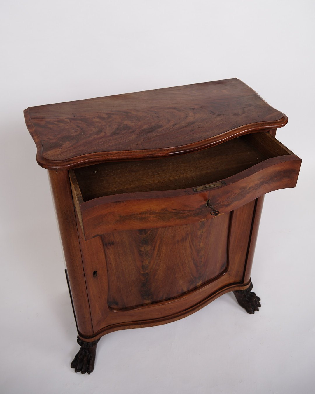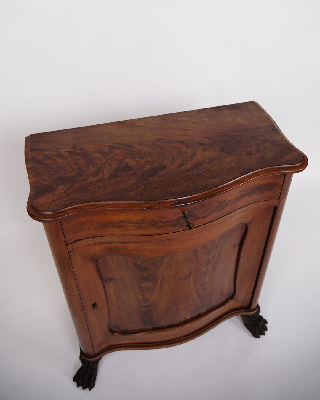 Small console/hallway unit from the 1890s, made of hand-polished mahogany with a flamed texture. The unit stands on detailed lion feet, which give it an elegant and classic look.