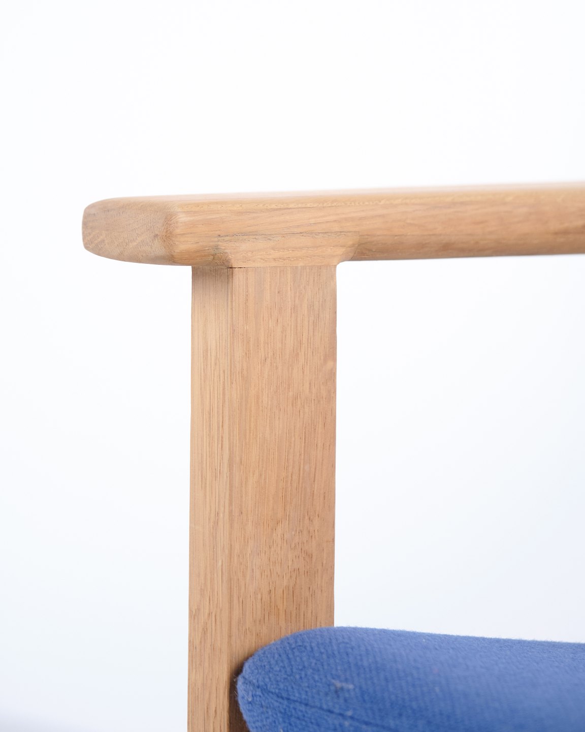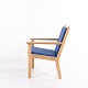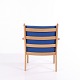 Lænestol model GE 284 designet af Hans J. Wegner og fremstillet af Getama. Udført med stel i massivt egetræ og løse hynder betrukket med blå uld. Klassisk Wegner-design med god siddekomfort og en kompakt form, der passer i både moderne og traditionelle indretninger.