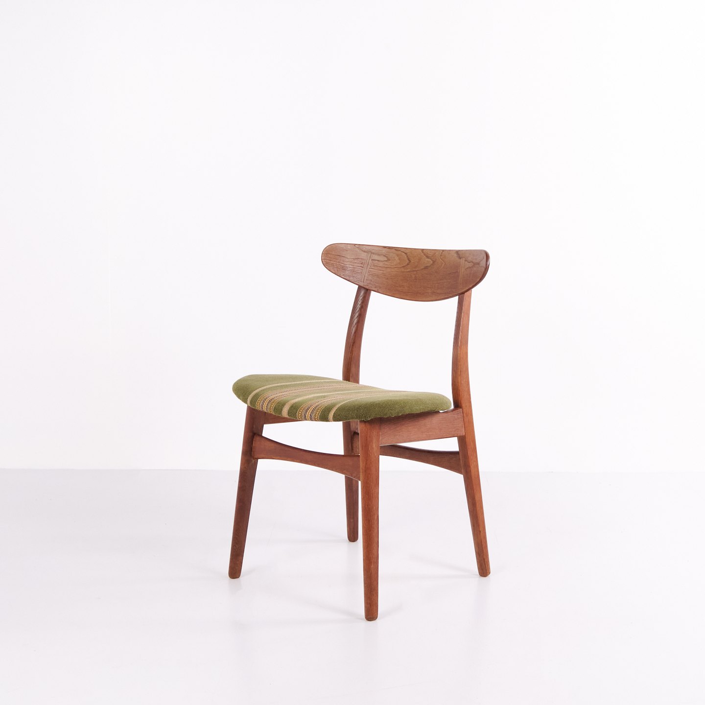 Sæt af seks spisebordsstole, model CH30, designet af Hans J. Wegner i 1954 og produceret i 1950’erne. Stolene er udført i teak og eg med originalt brændemærke. En klassisk Wegner-model med god siddekomfort og velkendt håndværk fra perioden.
