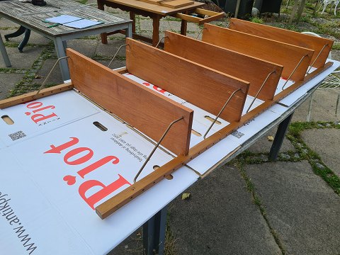 Reol til ophængning på væggen fra 1960'erne i finéret teak. Består 5 hylder á 80 x 20 cm. og 2 vanger á 198 cm. Pænt og ok velholdt dog med lidt brugsspor i form af overflade skrammer og uoriginale skruer. (Billede) |