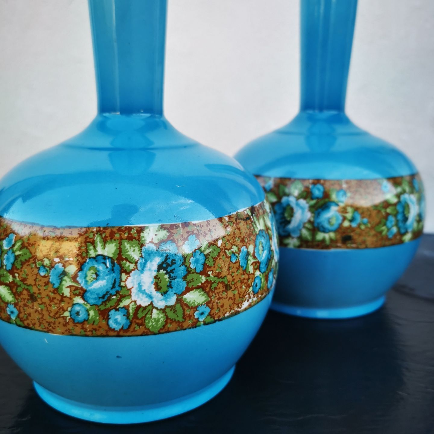 Pair of blue art deco faience vases with floral decorations from British Bavaria (B.P. Co. Ltd) in Scotland. Appears in good condition with no damage or repairs. Manufactured in the 1920s. Factory mark on the bottom. H. 26.5 cm (10.43 inches).