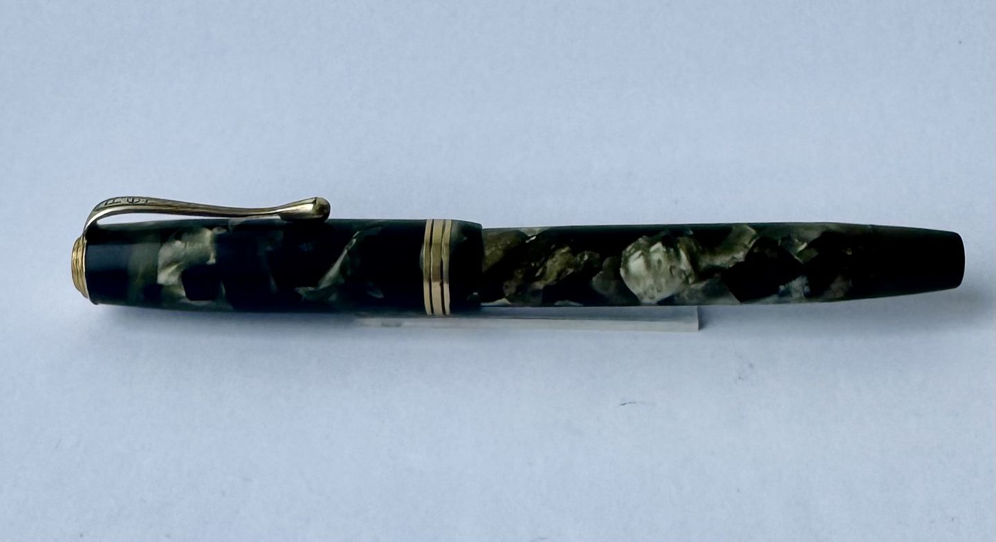 Grøn marmoreret Penol de Luxe fyldepen. Produceret på chr. Olsens fabrikker i København omkring 1945. Push button filler. Der skal indsættes en ny gummisæk før den igen kan optage blæk og skrive igen. Ny gummisæk kan indsættes for et tillæg på kr. 250,- Alle dele originale til denne model. Ingen skader eller reparationer. Lette almindelige brugsspor på overfladen. Længde 12,5 cm