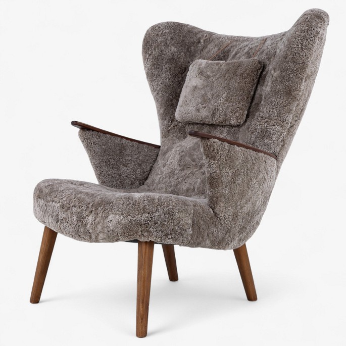 Nybetrukket lænestol med skammel i Scandilock-lammeskind (farve: Cork 19) og ben i hhv. teak og elm.