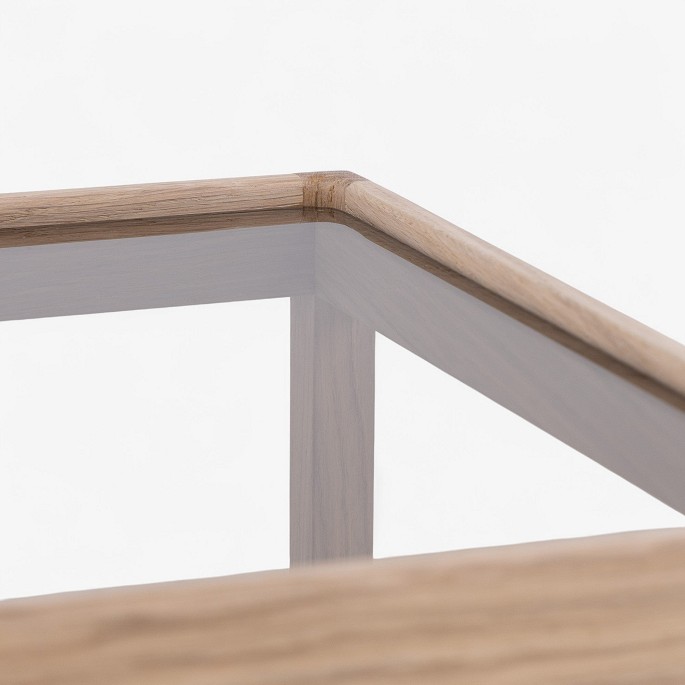 'Kubebord' med stel i lyst egetræ og røgfarvet glasplade.