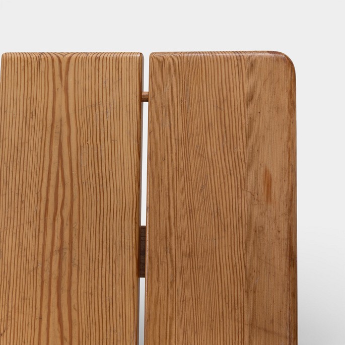 Bænk i massiv, lakeret fyrretræ. Mærket fra producent.