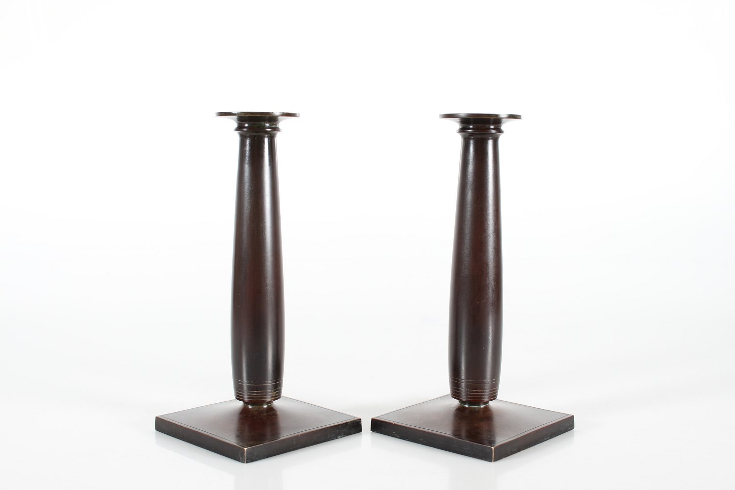 Just Andersen - Denmark Pair candlesticks made of bronze Model no. 155 Sign: Just A - Denmark + model B 155 Height 25 cm Length x width base: 11.5 x 11.5 cm Good vintage condition with beautiful brown patina
