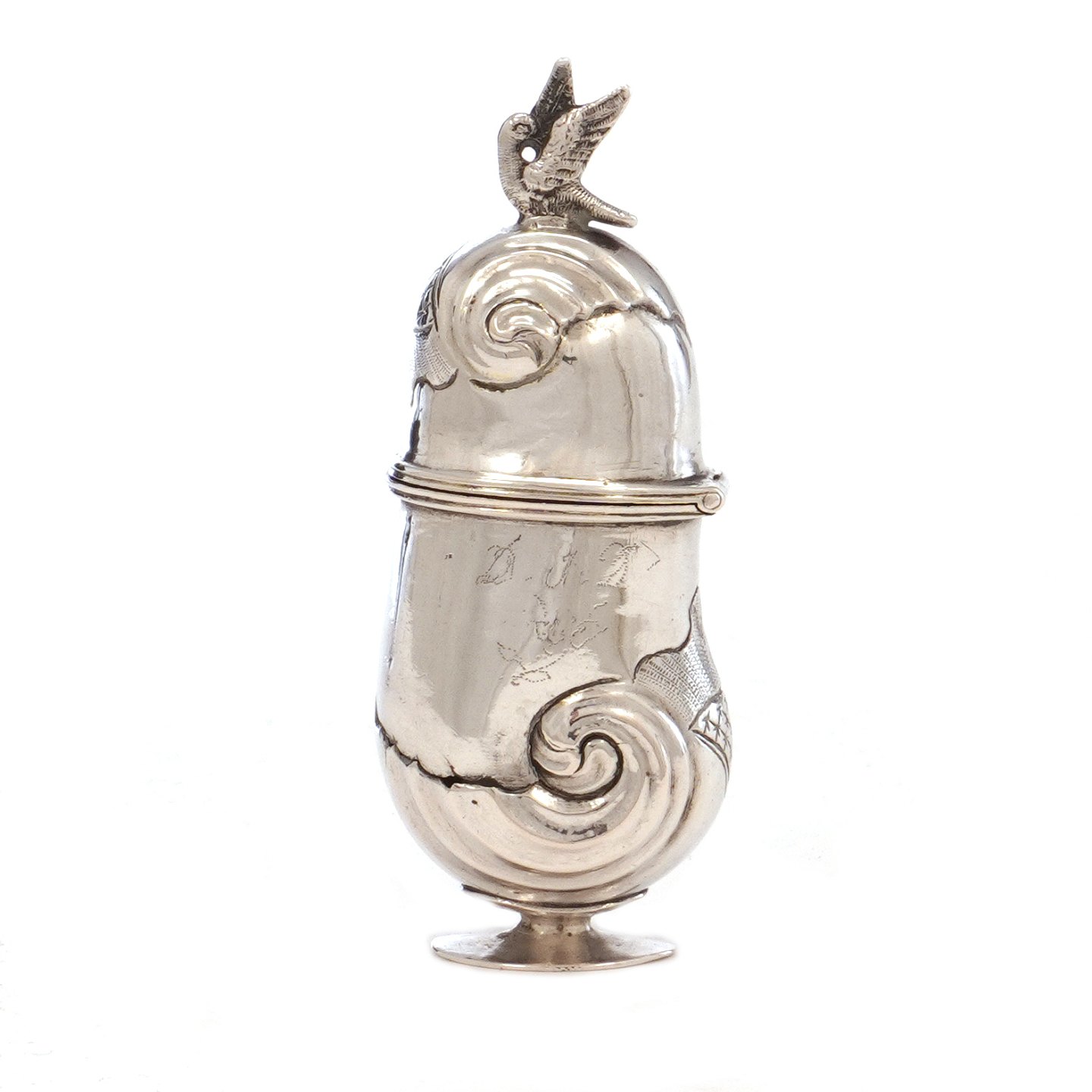 Hovedvandsæg i sølv såkaldt "Haneæg". Ustemplet. H: 8,5cm
