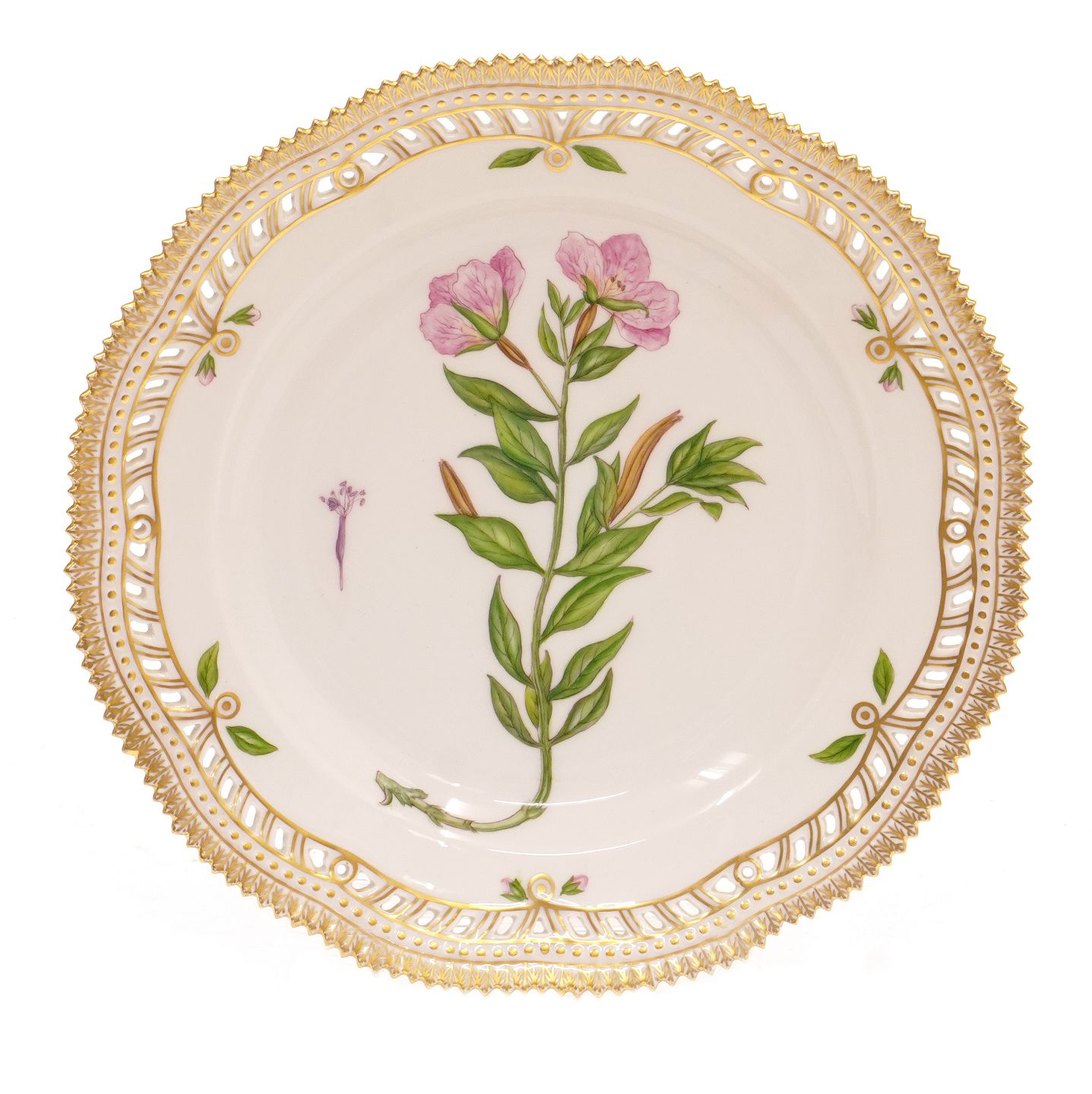 Flora Danica tallerken. Royal Copenhagen Flora Danica middagstallerken med hvælvet og gennembrudt fane model 3553. "Epilobium latifolium L.". Diameter 25,5cm.