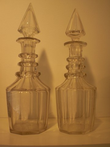 den større til venstre har det blå overfang på opaline og klart glas- proppen er ikke original. Ca. 1900. Højde med prop: 11,5 cm. Bredeste diameter: 7,5 cm. Solgt.