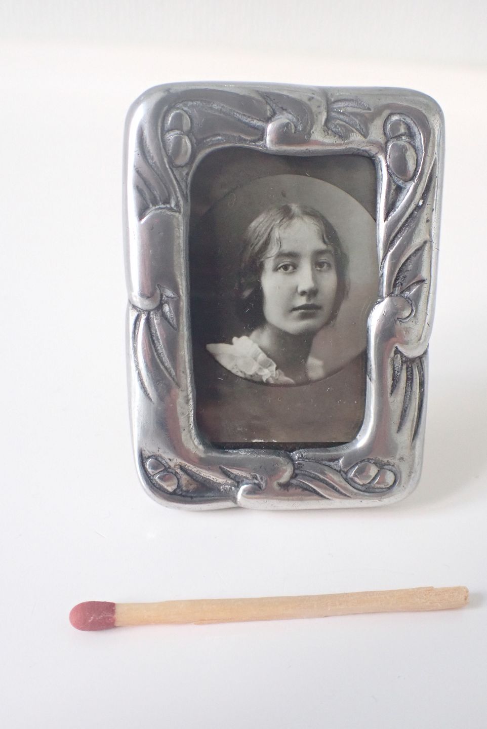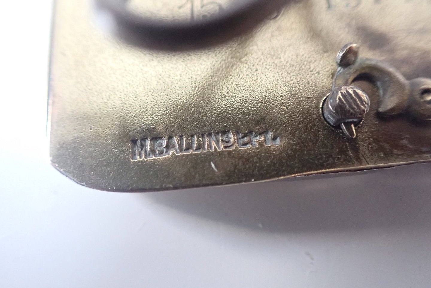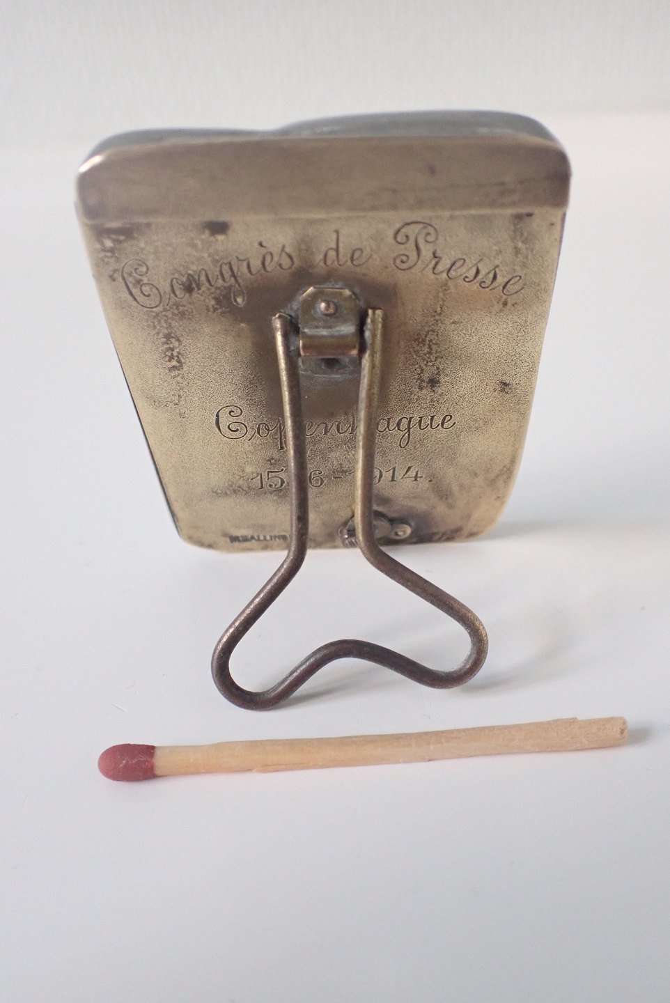 Mogens Ballins Eftf.(1906 -1926), en skønvirke visitkort ramme med messing bagplade og stander. Stemplet M. Ballin Eftf. Indgraveret på bagsiden: Congrès Presse, Copenhagen 15-6-1914. Er med i Vejenbogen side 198, T146. Design Mogens Ballin. Ydre mål: 6 x 4,5 cm. I fin stand med originalt glas, der dog mgl. et lille (usynligt hjørne)