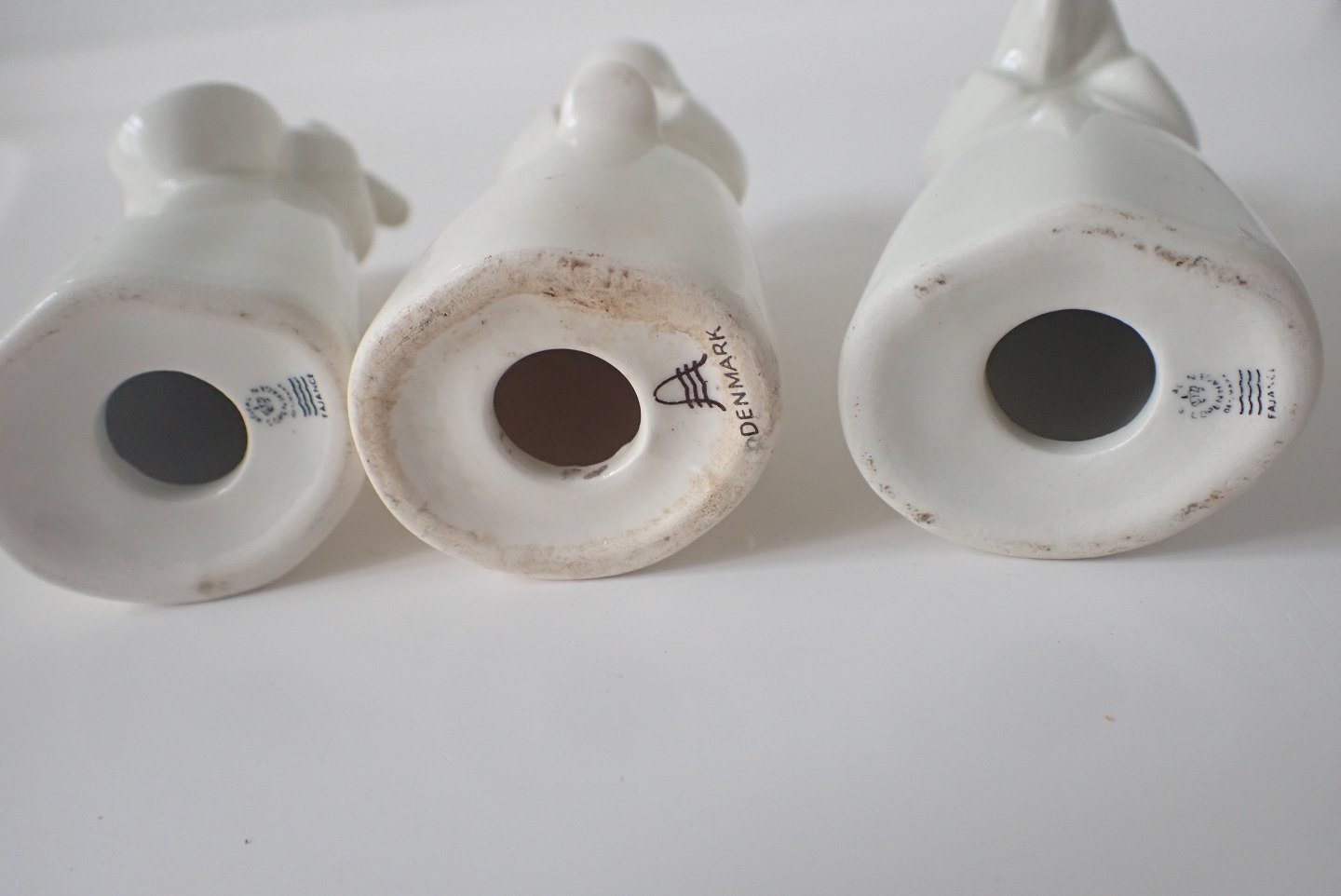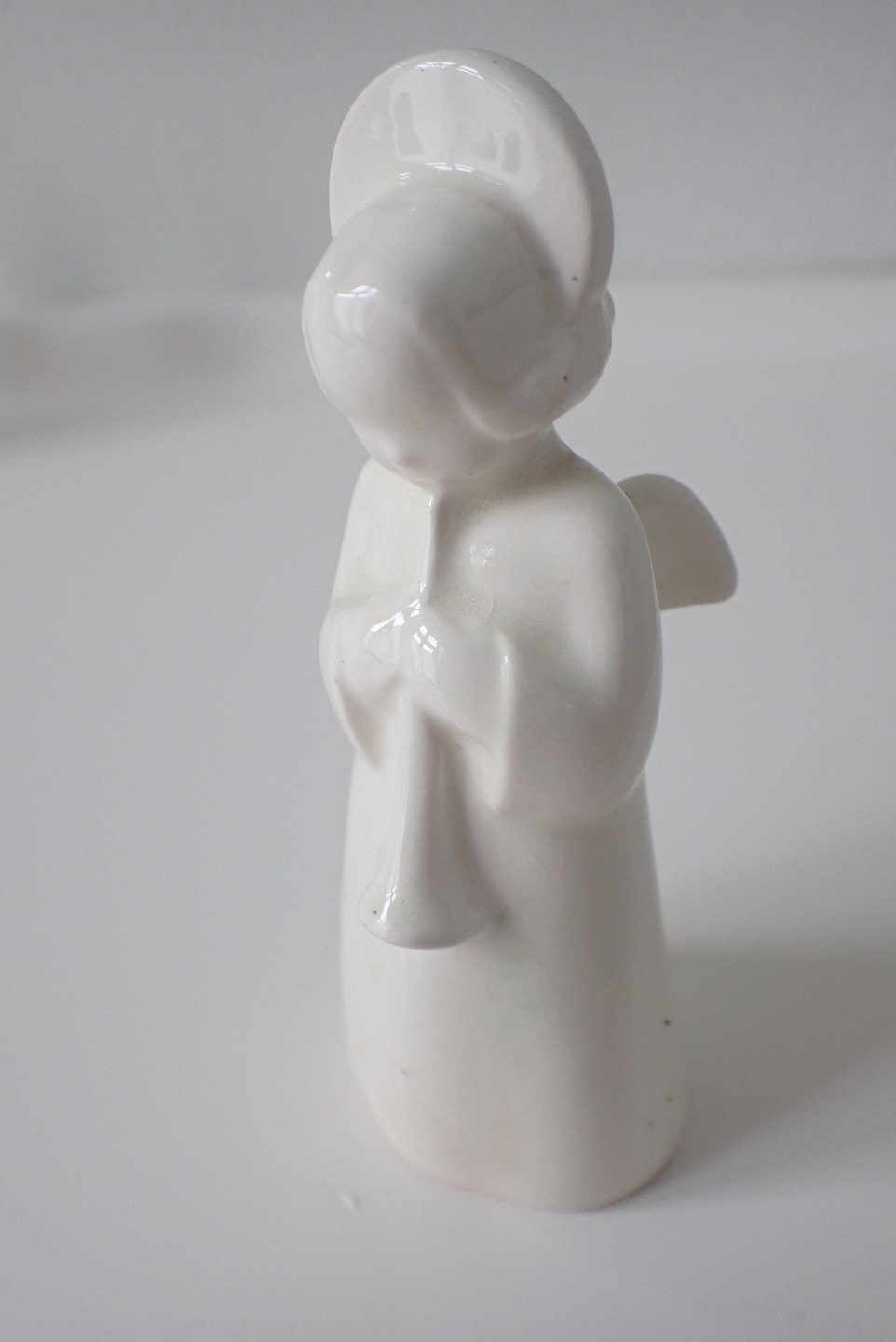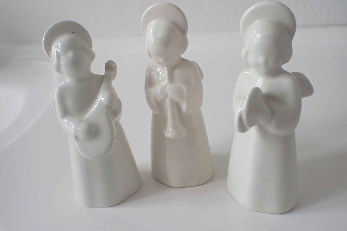 3 musikengle med bækken, fløjte og mandolin i fajance 2 fra Kgl. Porcelæn og 1 fra Aluminia. 1950 -erne. Højde: 9,5 cm. I Fin stand.