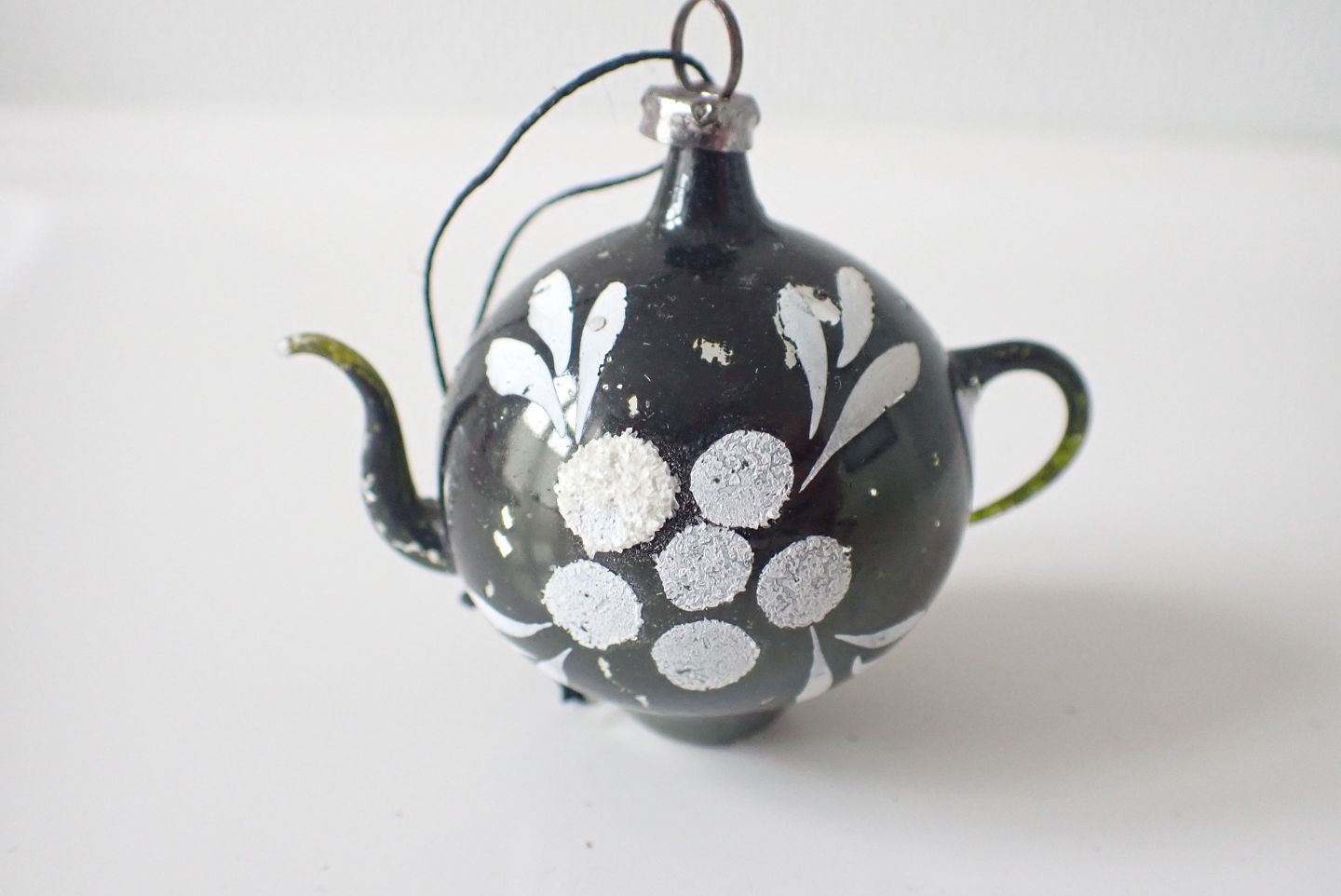 ! Stk. glasjulepynt - sort tekande med hvid håndmalet dekoration. Med ophæng og kan stå. Stammer fra Leipzig tidlig 1900-tal. Højde: 7,2 cm. Bredeste diameter: 4,3 cm. I fin stand.