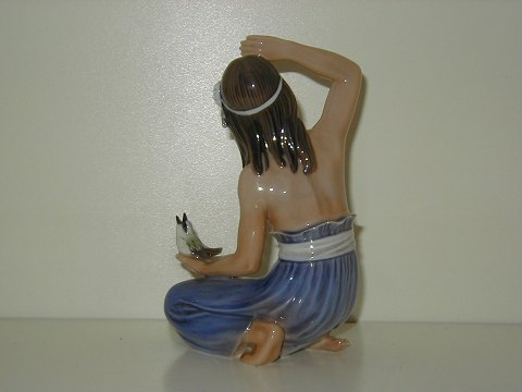 Dahl Jensen Orientel Figurine: Girl from Hawaii holding bird, decoration number 1268, factory second, measures 17 by 10.5 cm. Great colors, perfect condition.