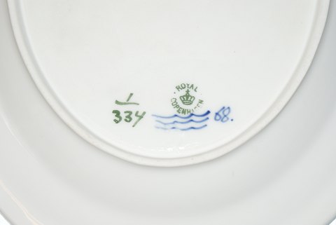 Kongelig Musselmalet Riflet, Ovalt fad, Tyk kant Produceret før 1923 Dekorationsnummer 1/334 1.Sortering Længde 30,5 cm. Bredde 24 cm. Perfekt og velholdt stand