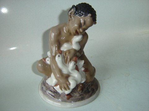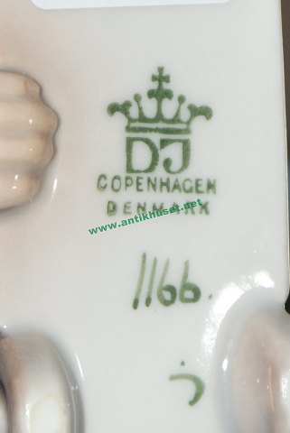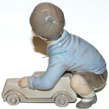 Dahl Jensen Figur , Dreng med bil Modelleret af Anker Dahl-Jensen Dek. nr. 1166 1. sortering. Længde 14 cm. Højde 13,5 cm. Flot og velholdt stand.