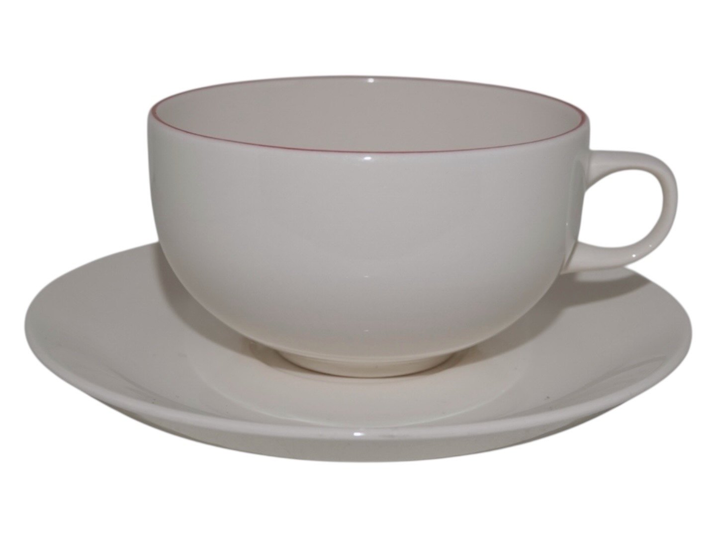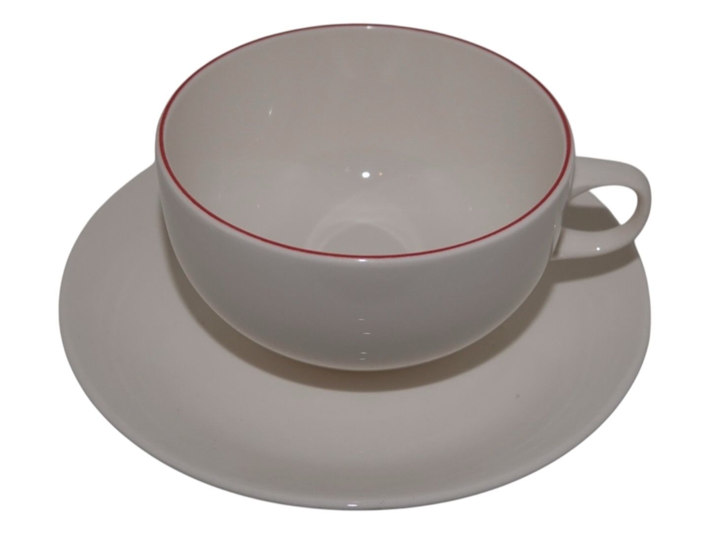 Royal Copenhagen Red Line (Red top), teacup with matching saucer. Designed by Grethe Meyer. Decoration number 3074. The cup measures 9.5 cm. across. Perfect condition with no chips, cracks or repairs.