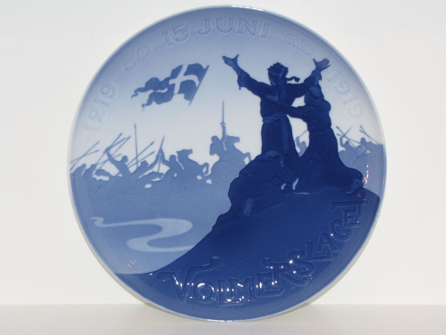 Bing & Grøndahl Mindeplatte fra 1919. 700 året for Volmerslaget da Danmark indtog Estland i 1219. 1. sortering. Diameter 25,0 cm. Perfekt stand uden fejl.
