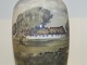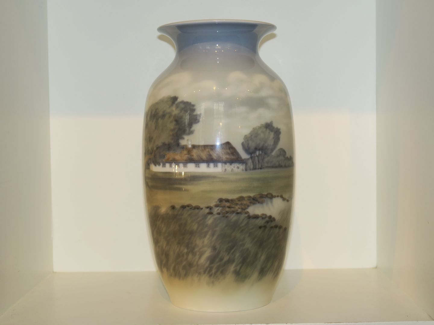Royal Copenhagen stor vase med stråtækt bondegård. Den er dekoreret hele vejen rundt.