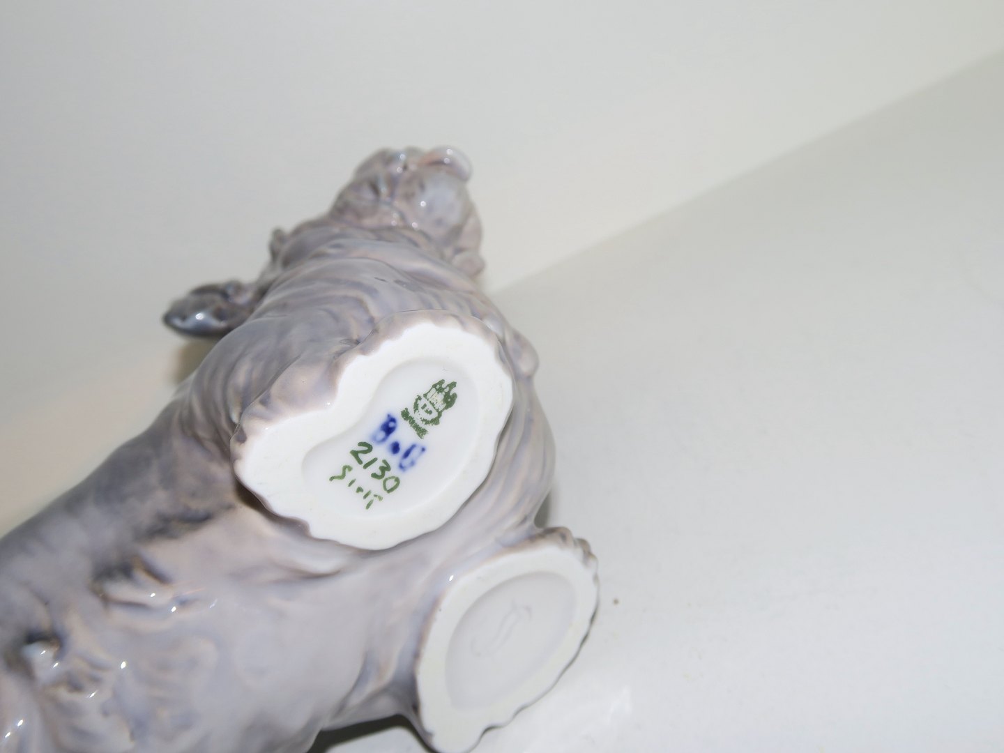Stor Bing & Grøndahl hundefigur, skye terrier. Fabriksmærket viser, at denne er fra mellem 1915 og 1948. Dekorationsnummer 2130. 2. sortering. Længde 24,5 cm. Perfekt stand uden fejl.
