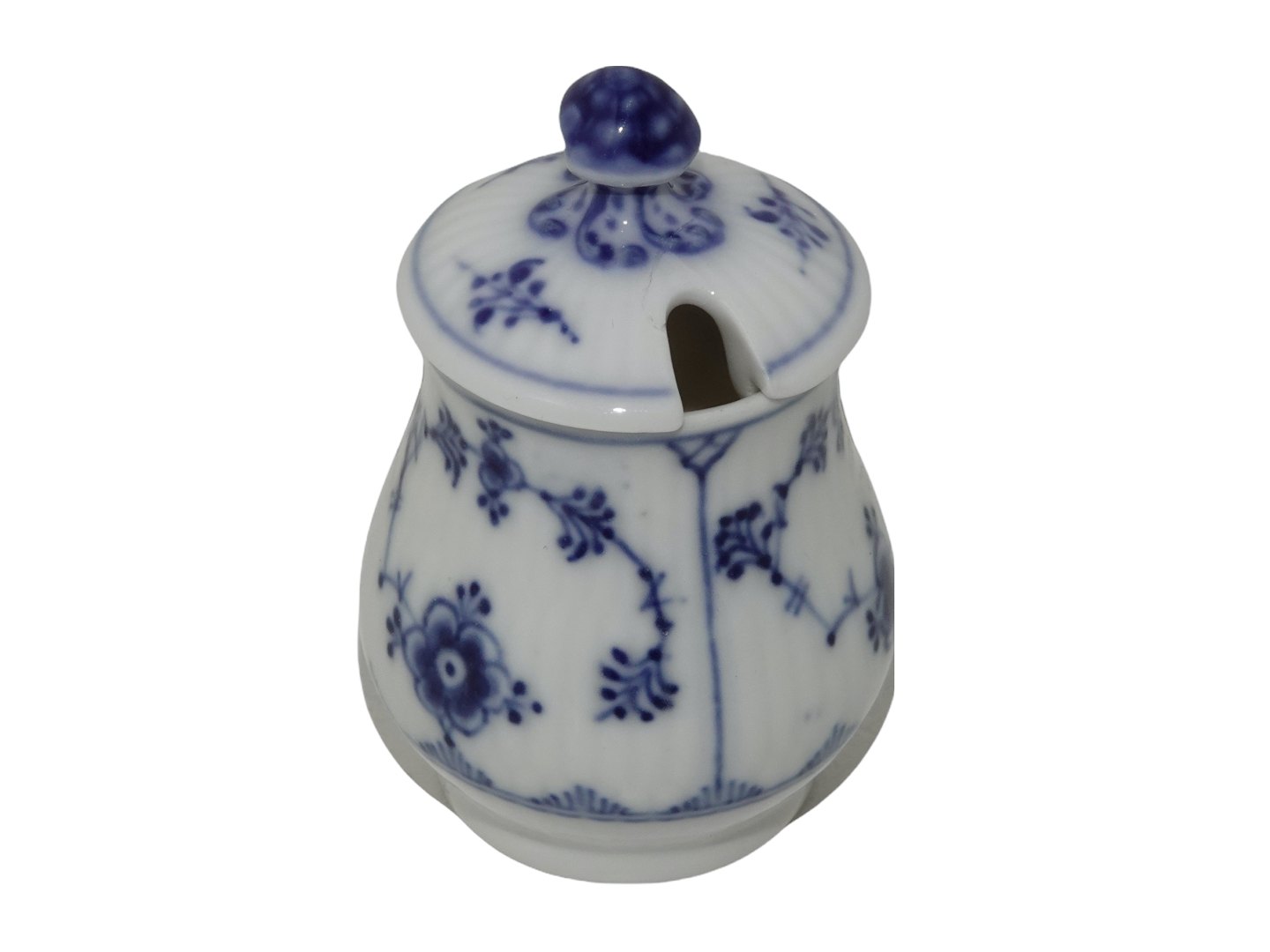 Royal Copenhagen Musselmalet Riflet, lille sennepskrukke med låg. Fabriksmærket viser, at denne er fra mellem 1898 og 1923. Dekorationsnummer 1/358. 1. sortering. Højde 7 cm. Perfekt stand uden fejl.