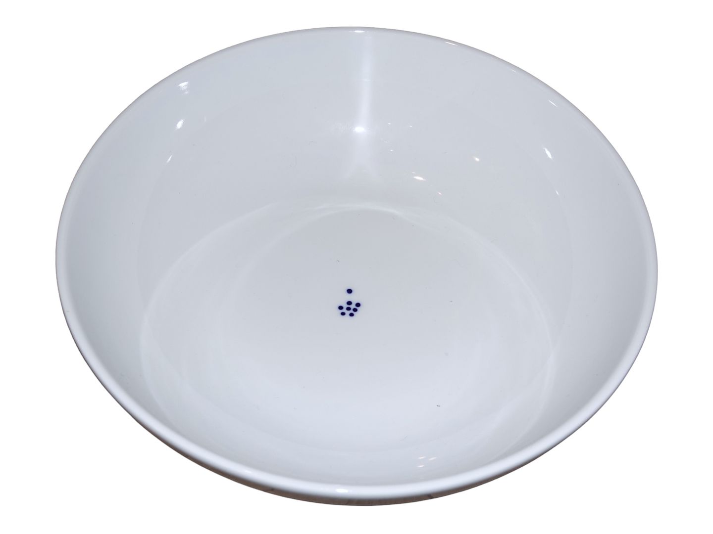 Royal Copenhagen, stor skål med blå prikker. Designet af Ursula Munch-Petersen. Dekorationsnummer 570. 3. sortering men solgt til medarbejder og flot eksemplar. Diameter 38,3 cm. Perfekt stand.