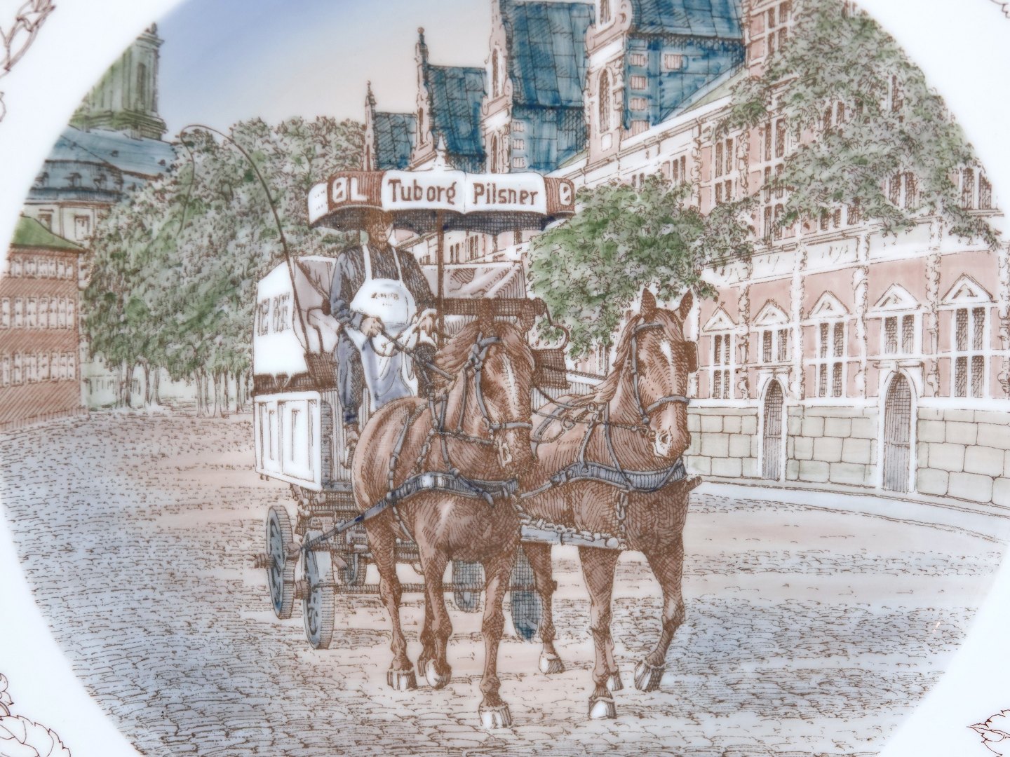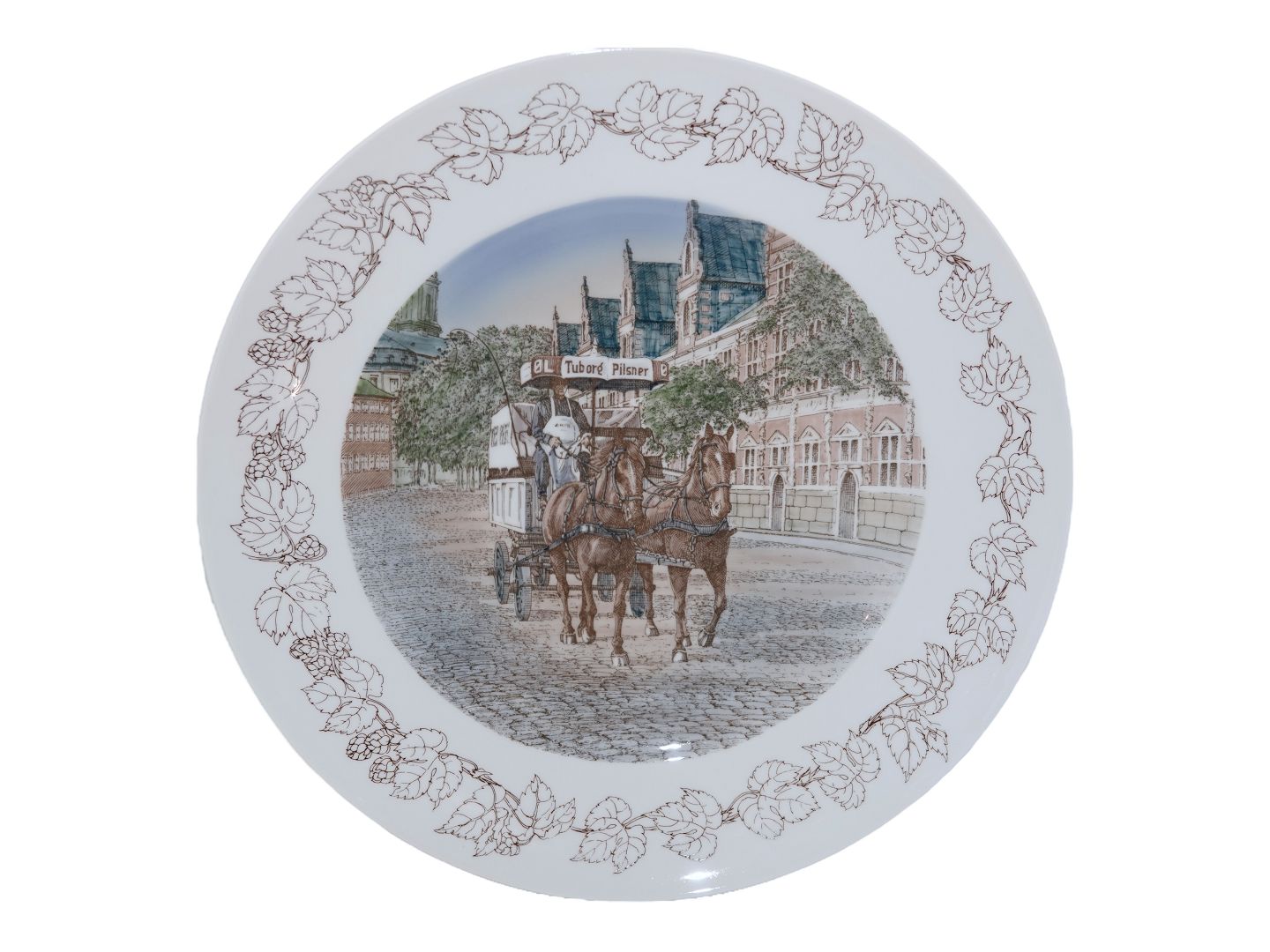 Stor Bing & Grøndahl platte, Tuborg Formandsforening med motiv af Tuborg hestevogn foran Børsen. Dekorationsnummer 3324/376. 1. sortering. Diameter 31,2 cm. Perfekt stand uden fejl.