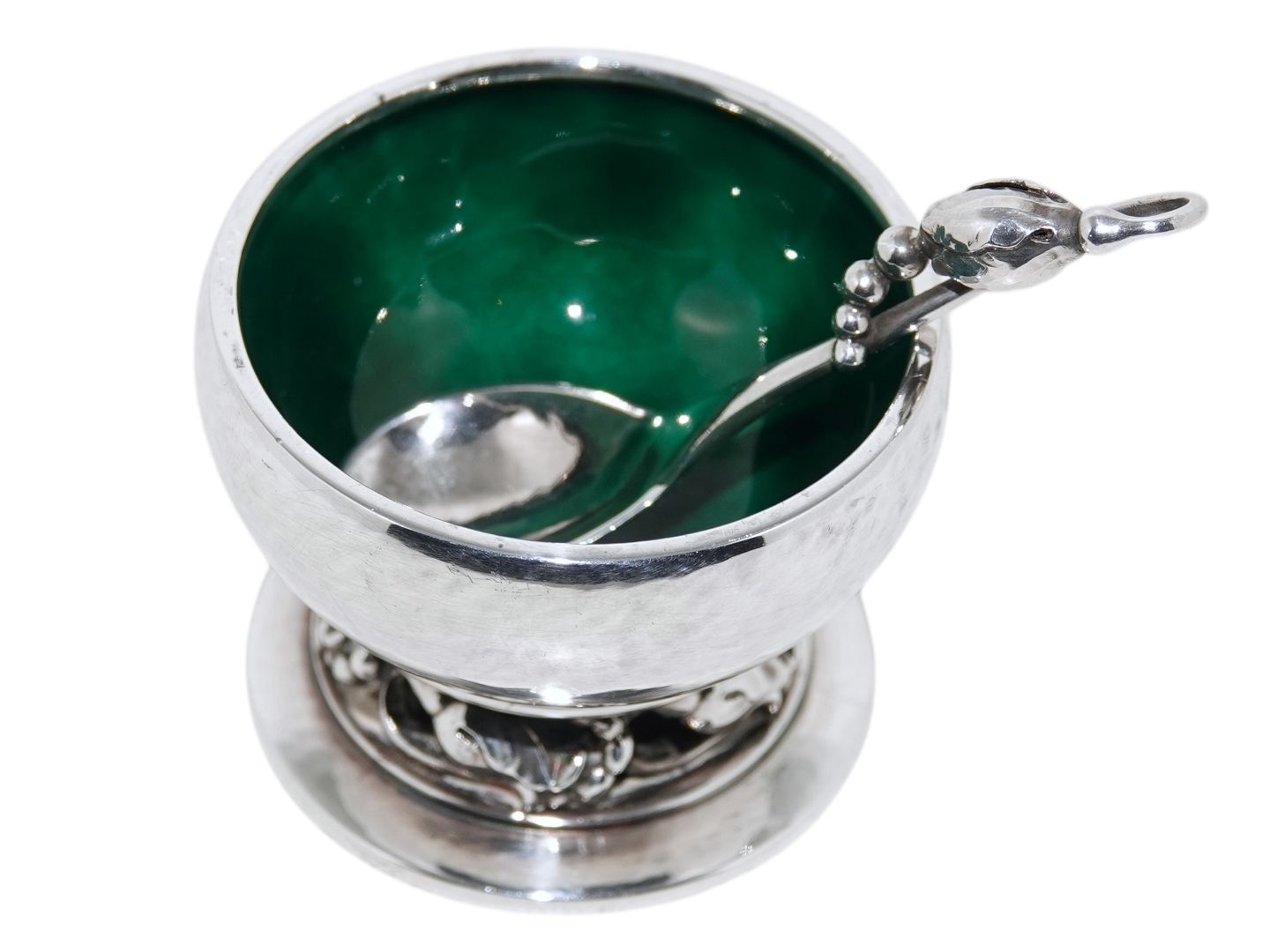 Georg Jensen Magnolia sterlingsølv, saltkar med grøn emalje og saltske.