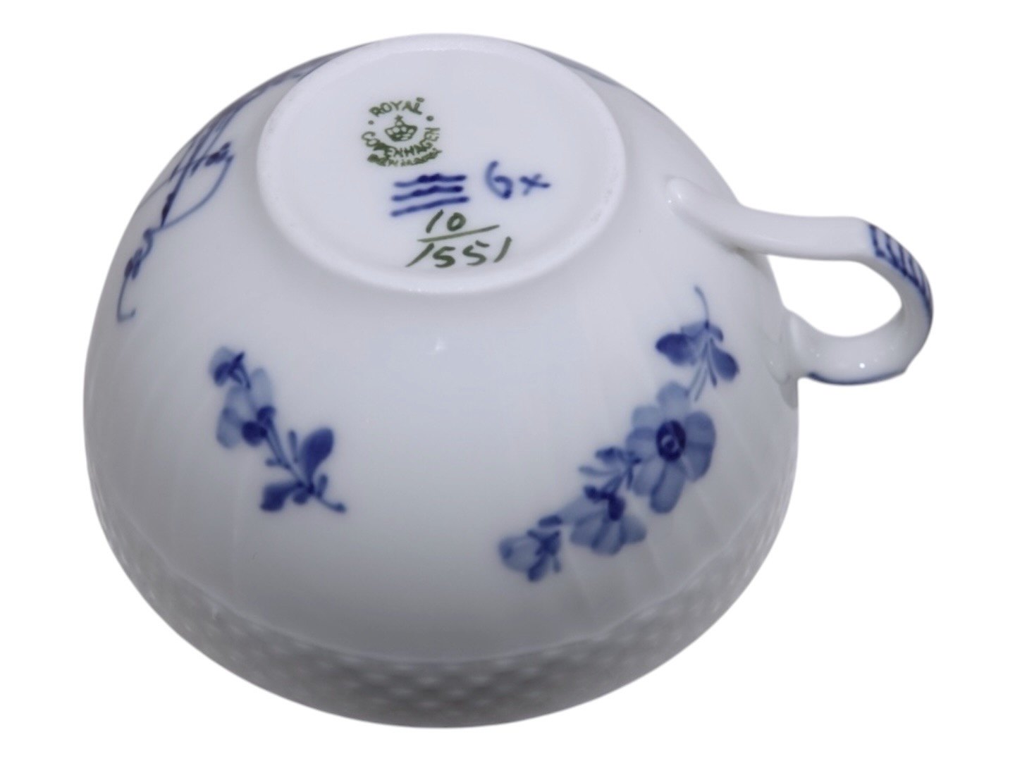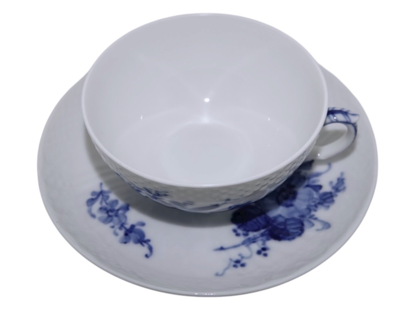 Royal Copenhagen Blå Blomst Svejfet, tekop med tilhørende underkop. Dekorationsnummer 10/1551. Koppen måler 10,2 cm. i diameter. Perfekt stand uden fejl.