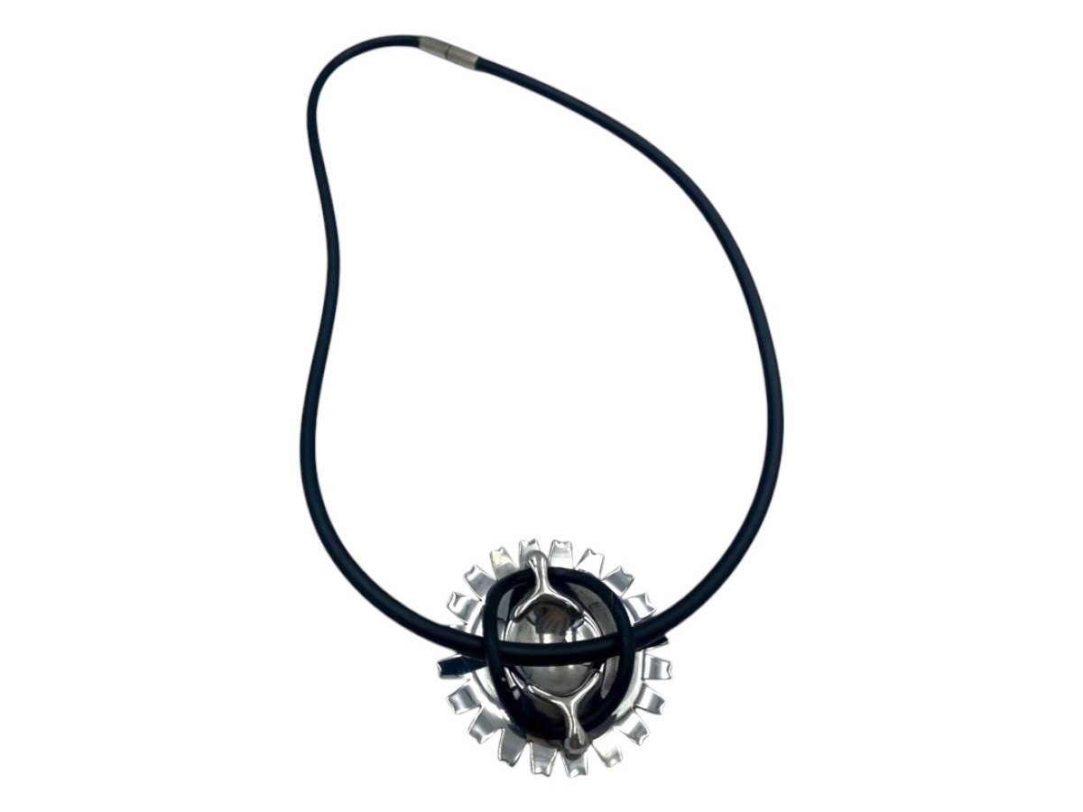 Georg Jensen sterling silver, black Daisy pendant in leather string. Diameter of the pendant is 4.2 cm., the string measures 42.0 cm. Excellent condition.