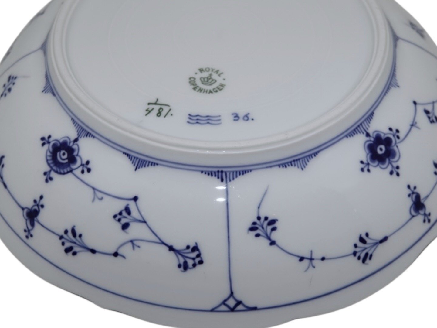 Royal Copenhagen Musselmalet Riflet, rund, lav skål med bølget kant.