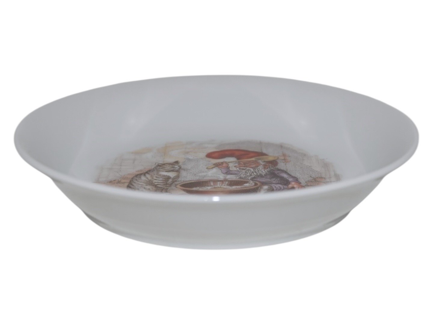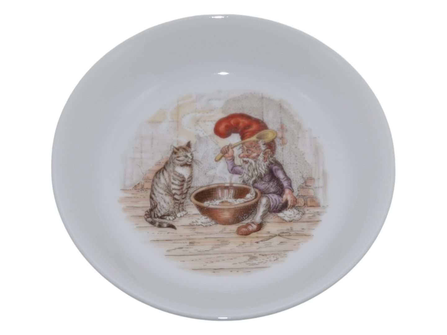 Royal Copenhagen julestel, asiet med julenisse og kat.