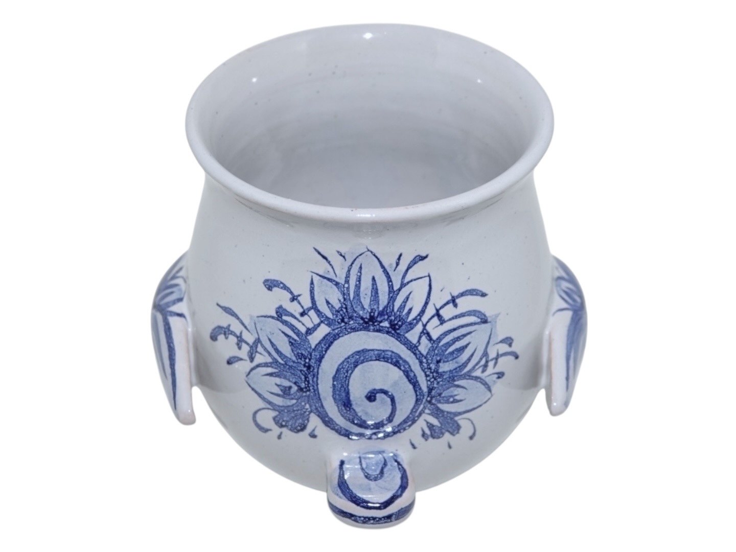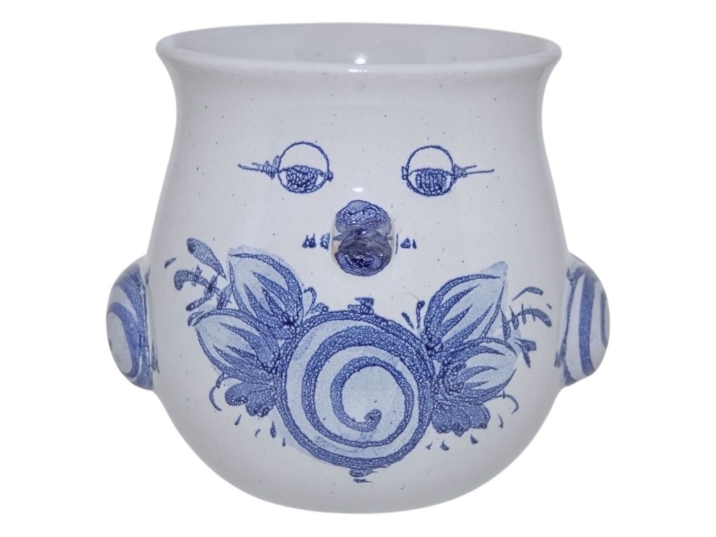 Bjørn Wiinblad keramik, lille urtepotteskjuler i form af fugl med næb, vinger og hale. Denne er med blå dekoration.