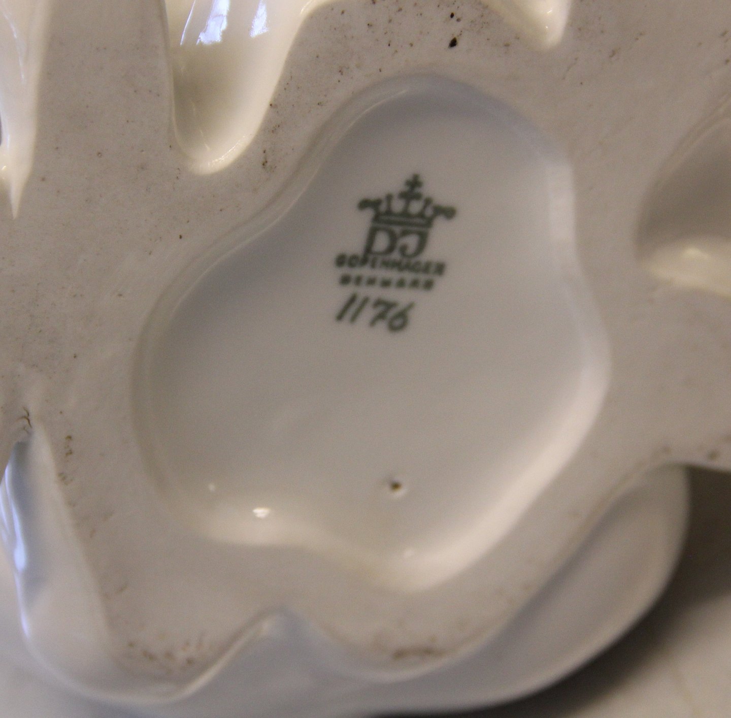 Dahl Jensen faun 1176 Pan med fløjte og nøgen kvinde (Jens Jacob Bregnø) 19 cm, hvid. Mærket med kongelig krone og DJ Copenhagen 2. i hel og fin stand.