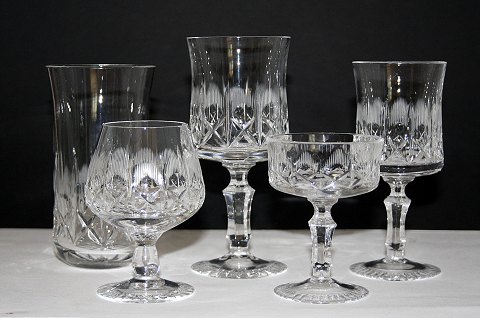 Text available in Danish: Offenbach krystal glas, Lyngby glas. Dette er et oversigtsbillede på de forskellige størrelser. Klik på linket www.susantik.dk/katindex.asp?kukat=5013 og klik på de separate fotos af de enkelte glas for at se pris og antal.