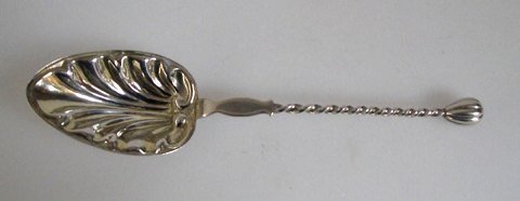 Marmelade ske i sølv, 1869, Danmark, med snoet skaft. L.: 18 cm. Stemplet FK, København.