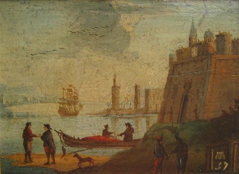 Italian artist (17th century.) A Italian port city with street life and a large sailing ship in the lagoon. Oil on poplar. 16 x 21 cm. Signed bottom right of the stone .: PS 37. On the back older numbers.